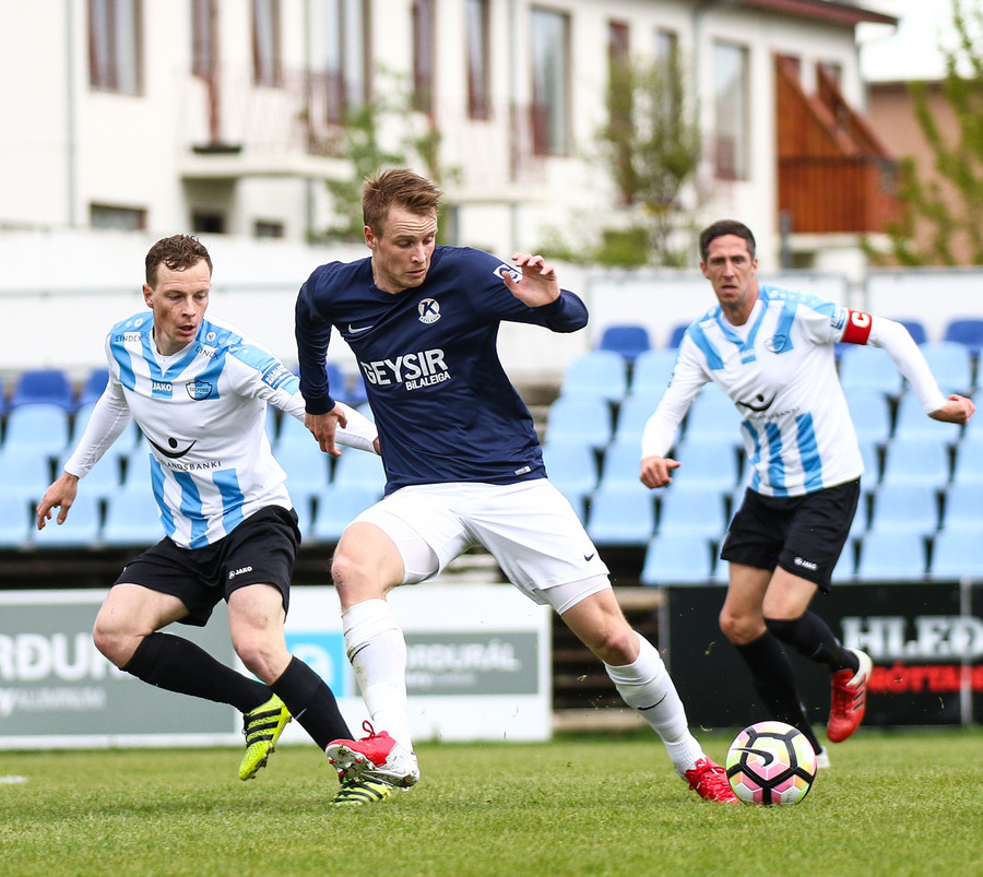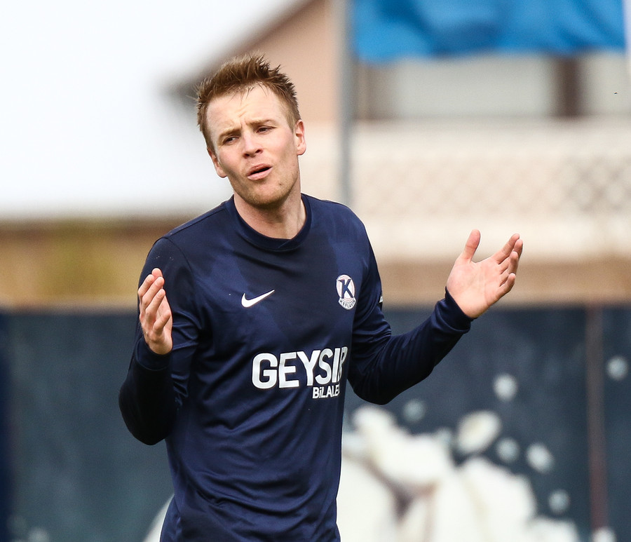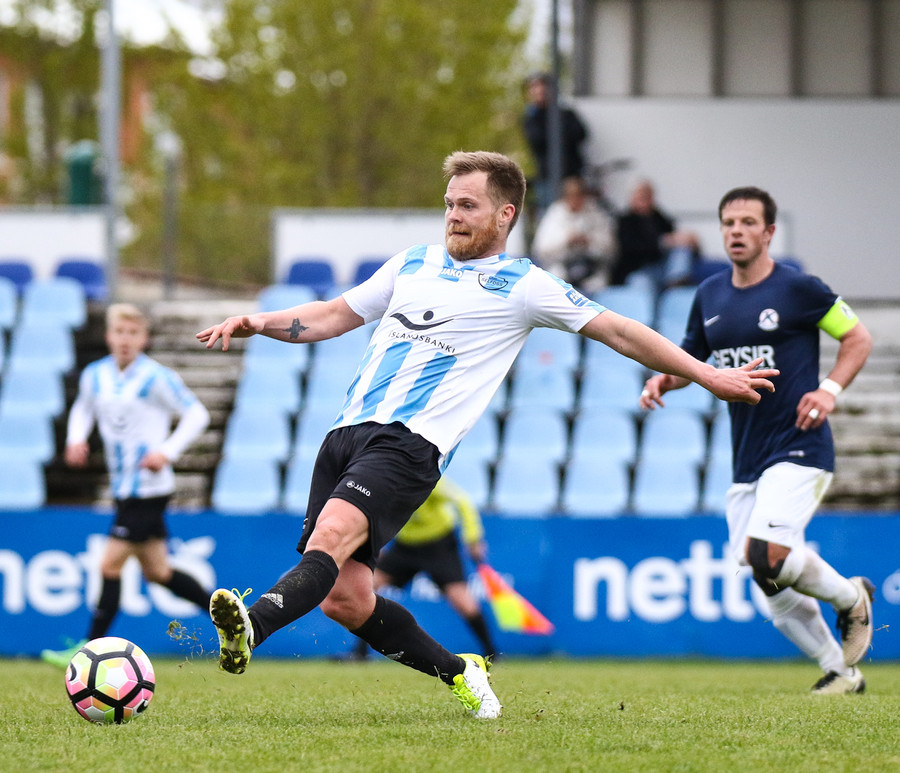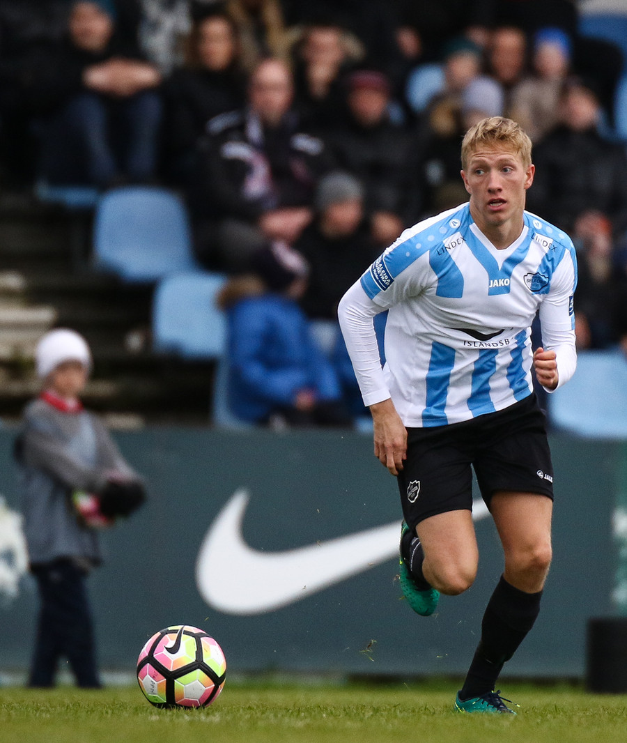 Jeppe hansen að láta Óttar virkilega hafa fyrir hlutunum og nálægt því að skora fyrsta mark leiksins. Greinilegt að dagskipunin er að Jeppe eigi að sækja á Óttar frekar en Andy og spurning hvort Óttar stenst pressuna lengi