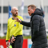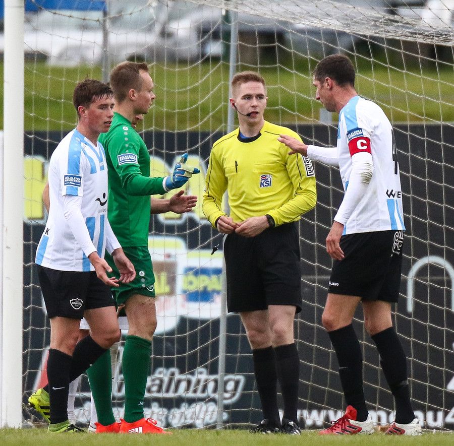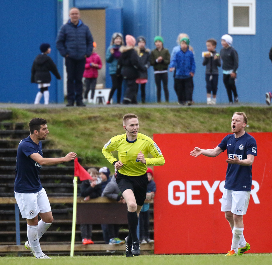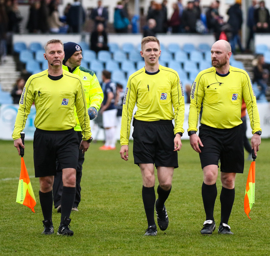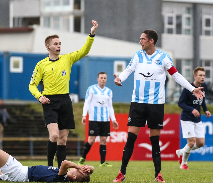 Það lítur út fyrir allavega eina skiptingu í hálfleik. Guðmundur Ársæll Guðmundsson dómari er meiddur og þarf að yfirgefa völlinn. Þetta er sennilega það markverðasta hingað til í leiknum.