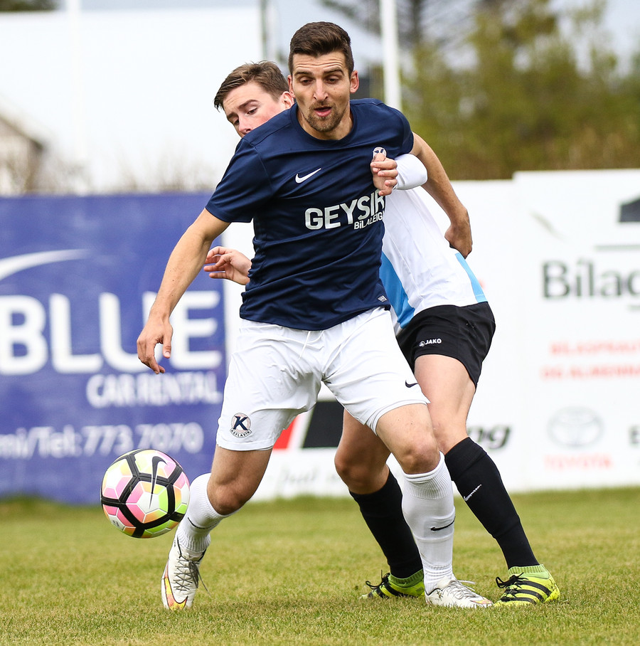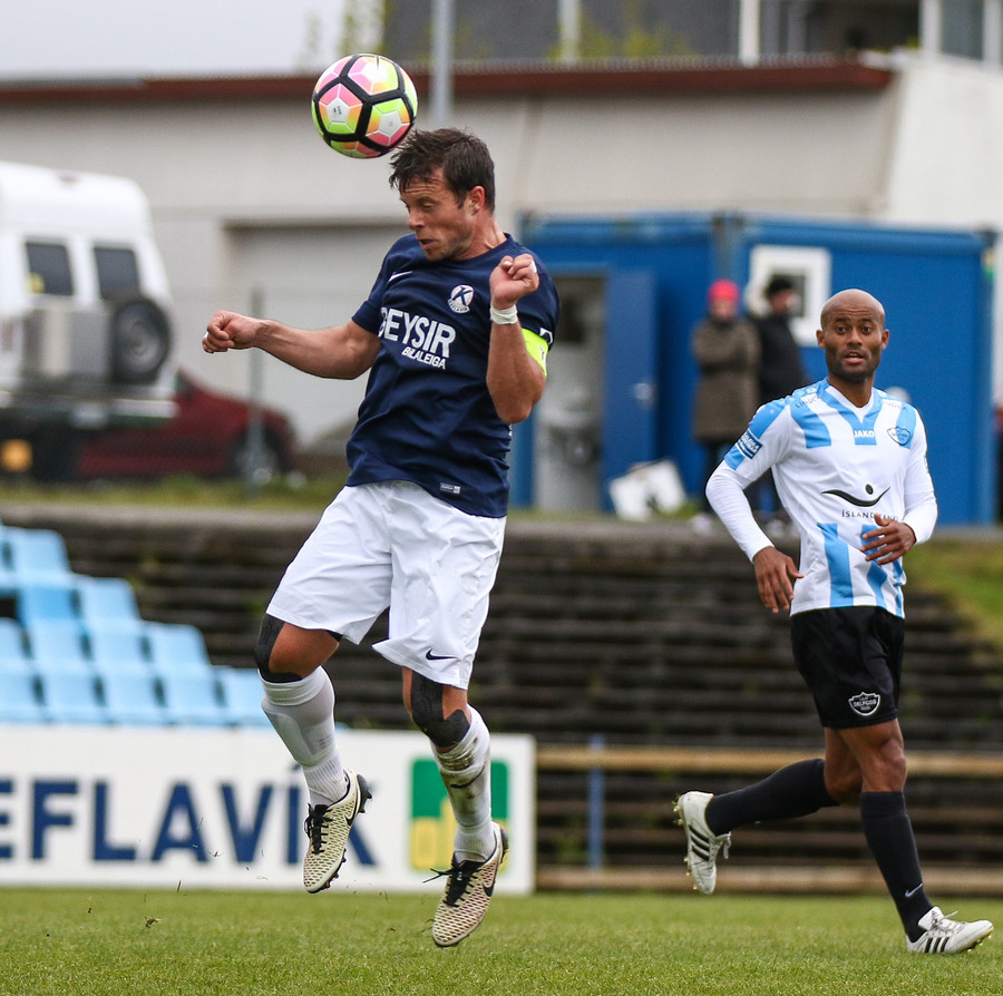 Alfi hér með skalla að marki Keflvíkinga eftir fyrirgjöf frá Elvari Inga en skallinn laus og Sindri ekki í neinum vandræðum.