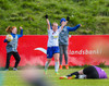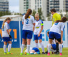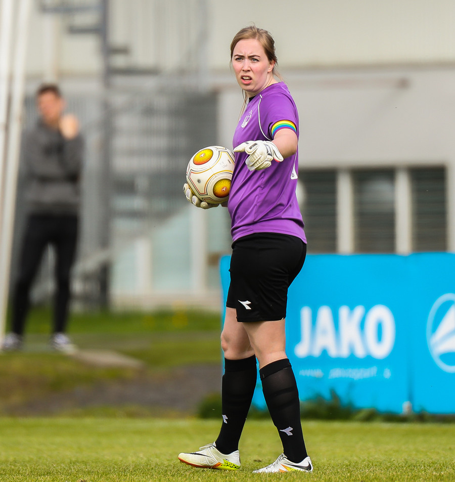 Andrea Magg skallar hornspyrnuna aftur fyrir og í annað horn. Í seinna skiptið rís Dagmar hæst og skallar frá.