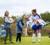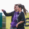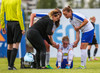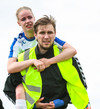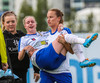 Bryndís María mætir grjóthörð úr öftustu línu og heldur á Söndru Dögg út fyrir hliðarlínu þar sem hægt er að sinna henni.
