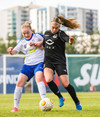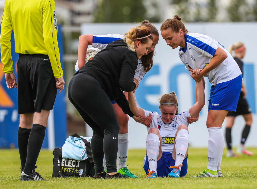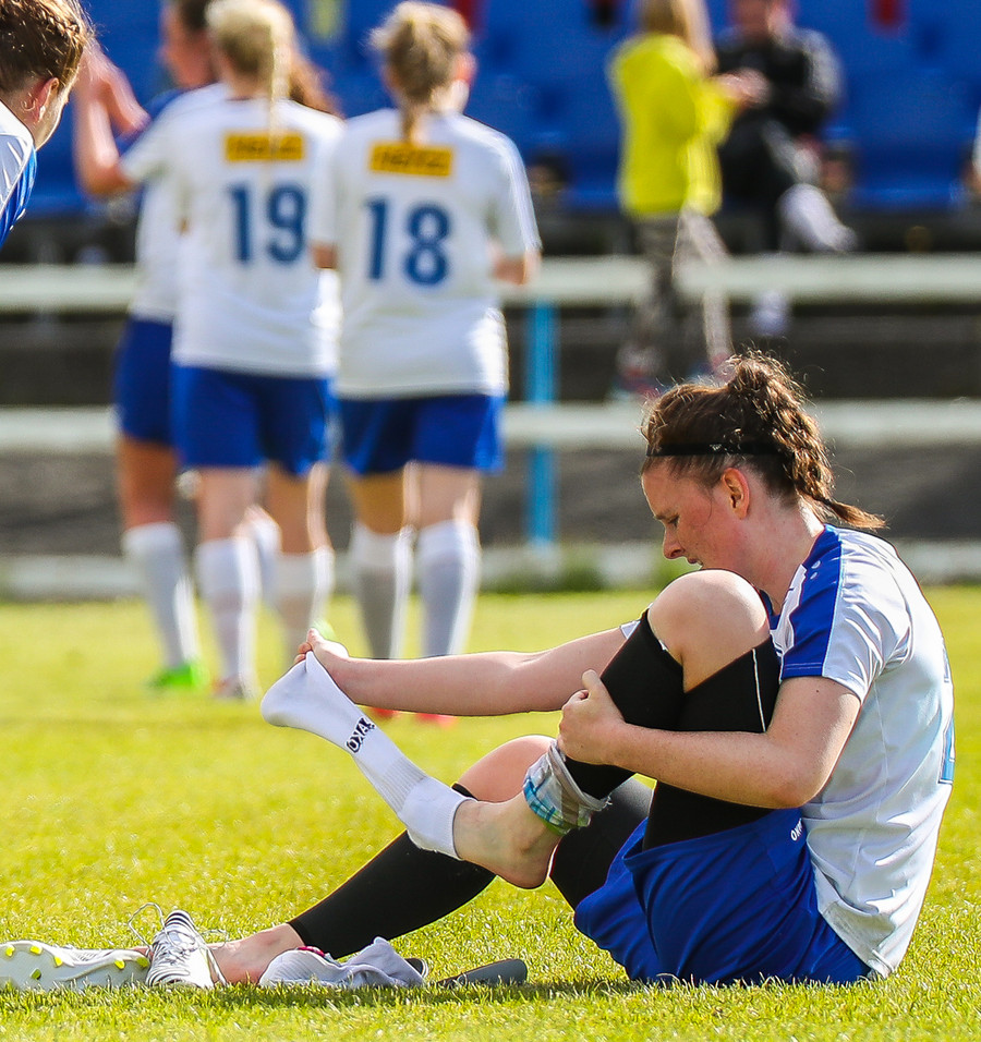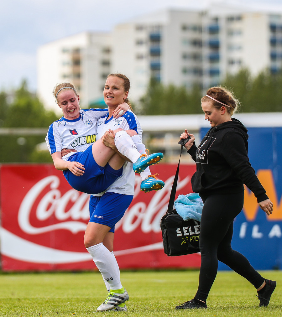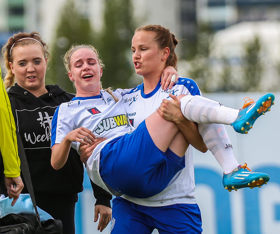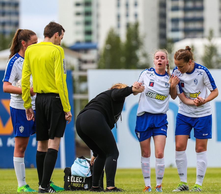 Rakel Sjöfn brýtur á Söndru Dögg úti á velli. Leit ekki illa út en Sandra Dögg liggur sárþjáð eftir og þarf aðhlynningu.