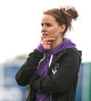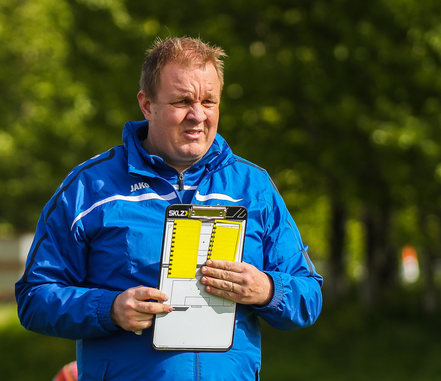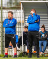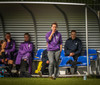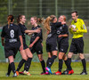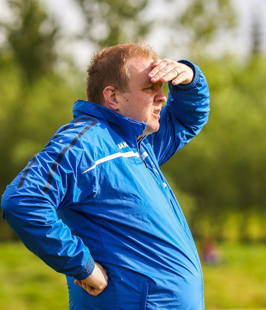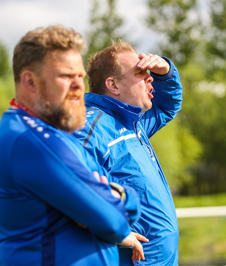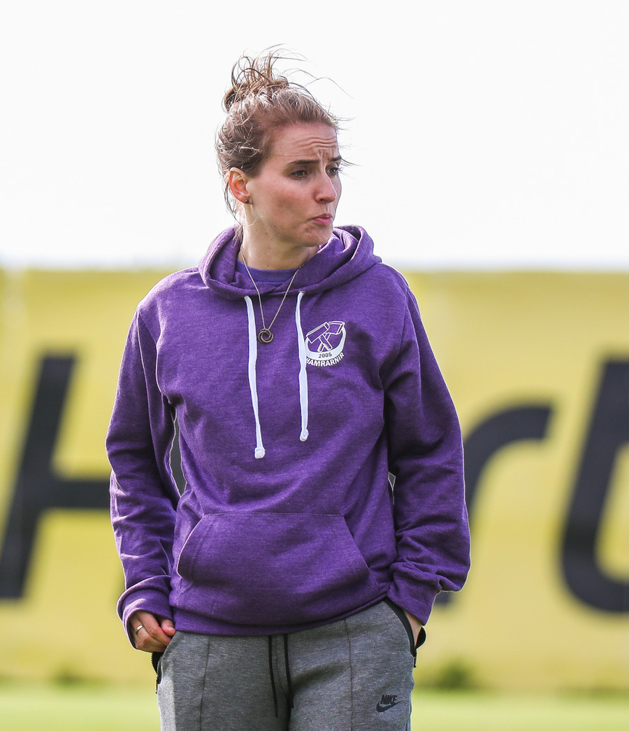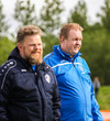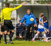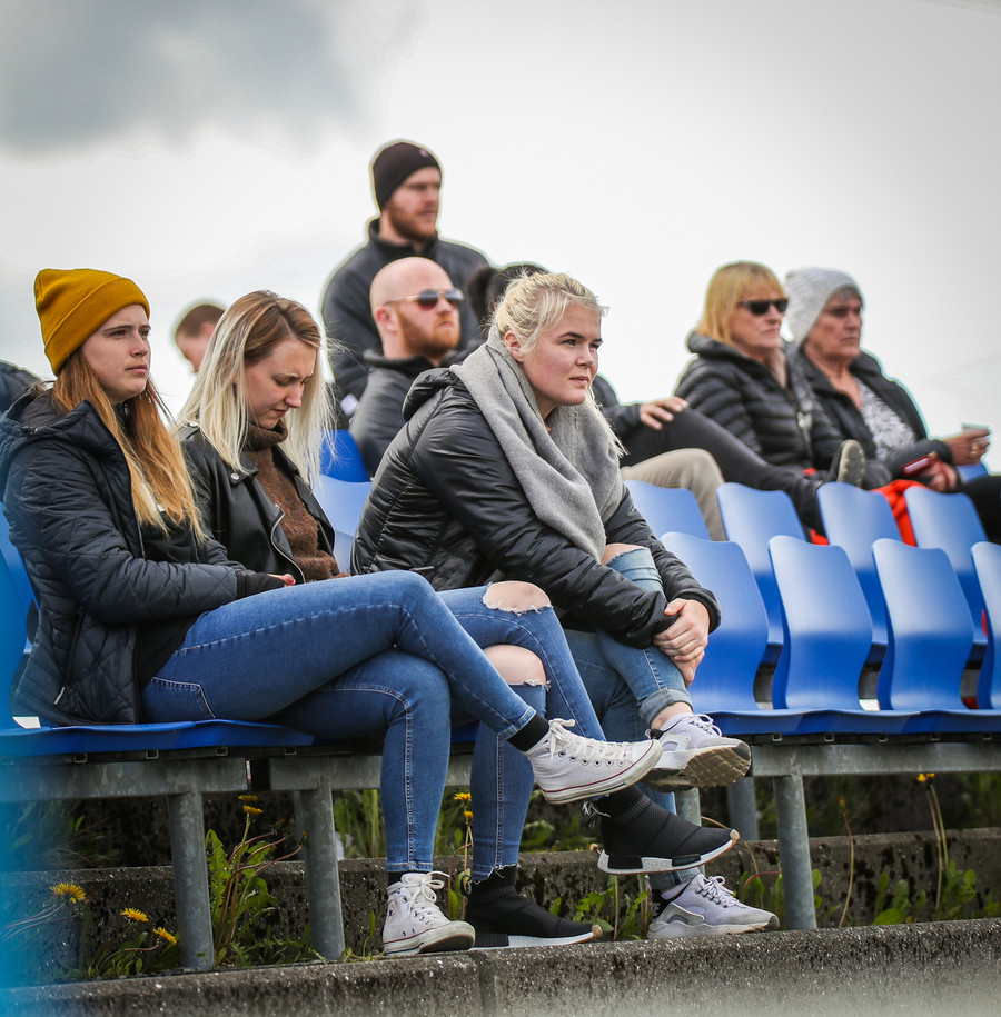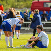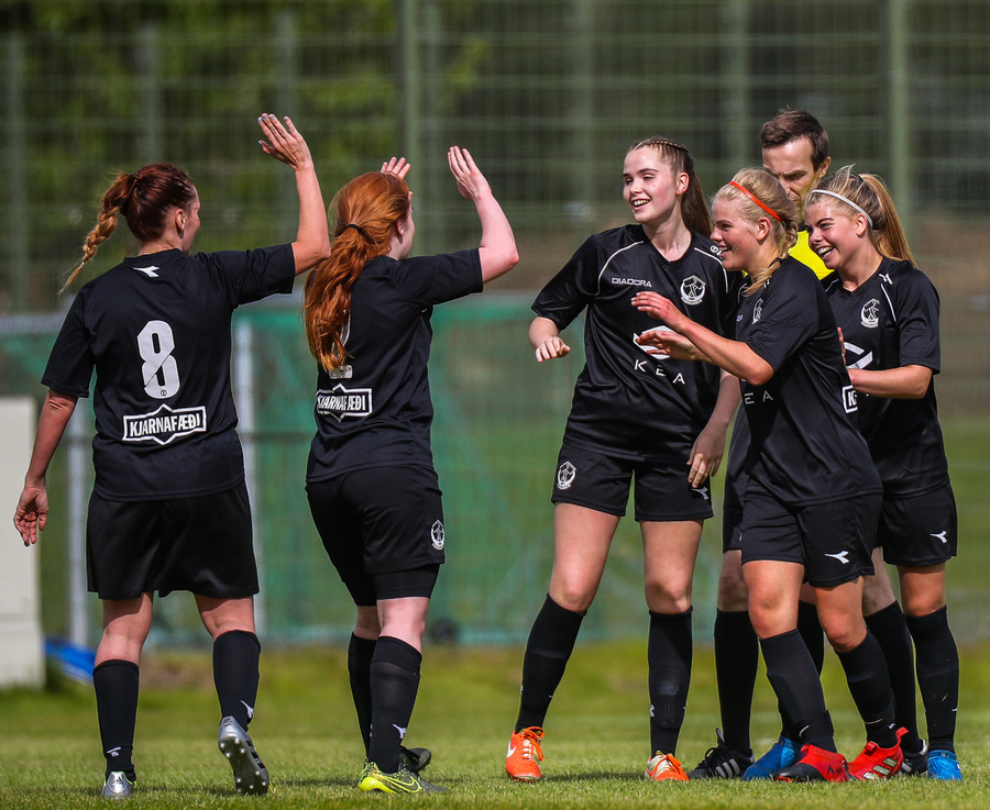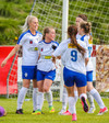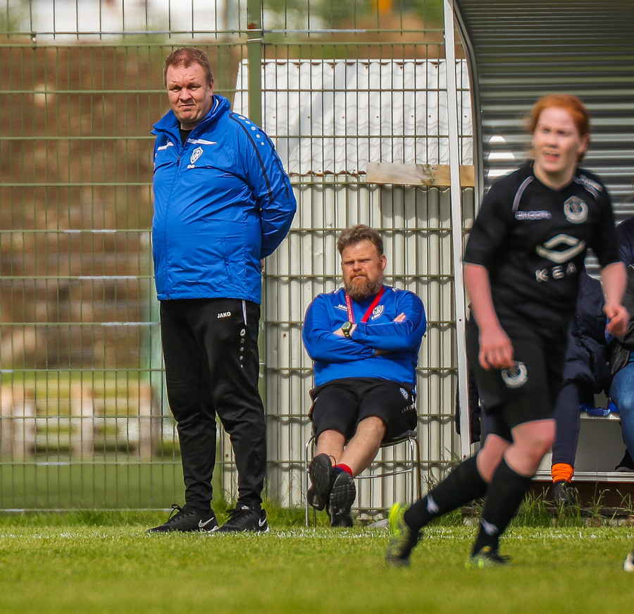 Ólík nálgun hjá liðunum í hálfleik. Heimakonur fara inn í hús en Karen Nóadóttir ræðir við sitt lið undir berum himni.