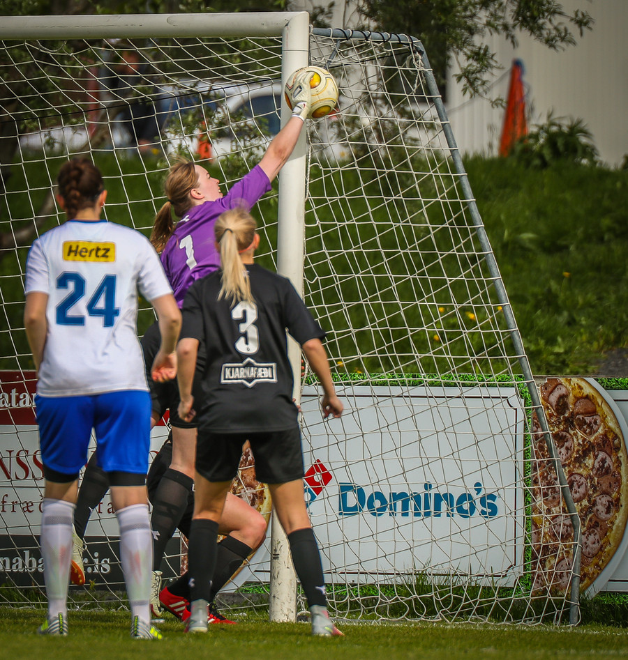 Þarna átti hún að gera betur. Fékk frábæra stungusendingu úr öftustu línu Hamranna. Var komin ein gegn Evu Ýr en fyrsta snertingin léleg hjá henni og Eva Ýr vann boltann.