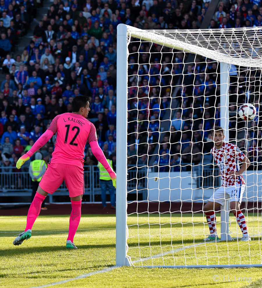 Stórhætta!! Boltinn berst á Mandzukic sem tekur boltann í fyrsta og ætlar framhjá Hannesi, en tekur boltann of langt og hann fer út af.