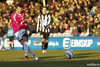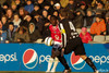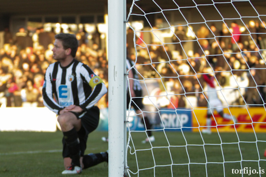 Bjarni Guðjónsson sá að Abel Dhaira var kominn langt út úr marki sínu og skaut af löngu færi! Abel rétt náði að blaka boltanum yfir! Þarna munaði litlu.