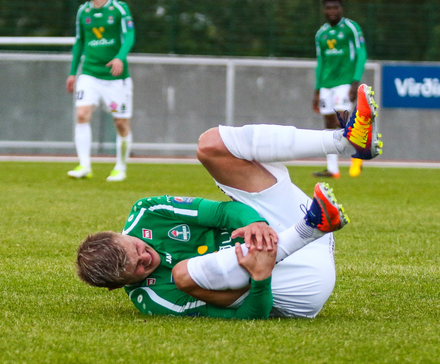 Andri Rúnar dettur hér niður og heldur um lærið. Stendur svo upp og biður um skiptingu.