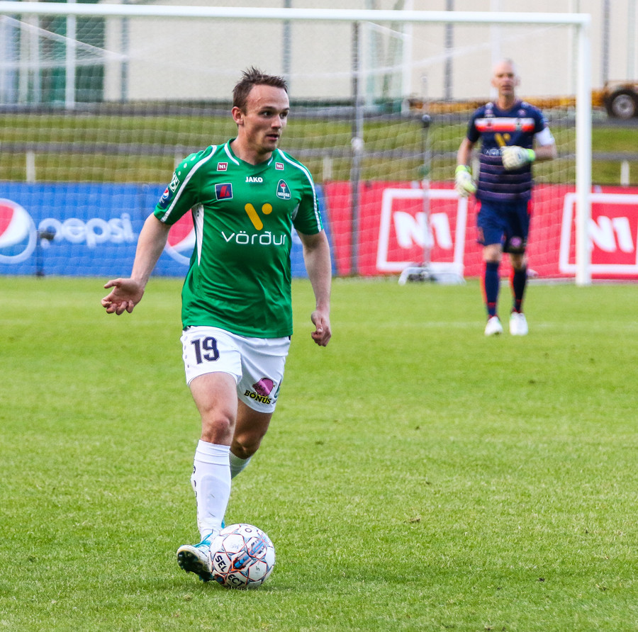 Höskuldur dettur ofaní bakvörðinn og Aron fer á kantinn.