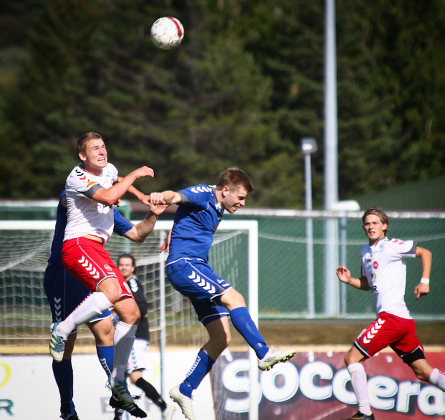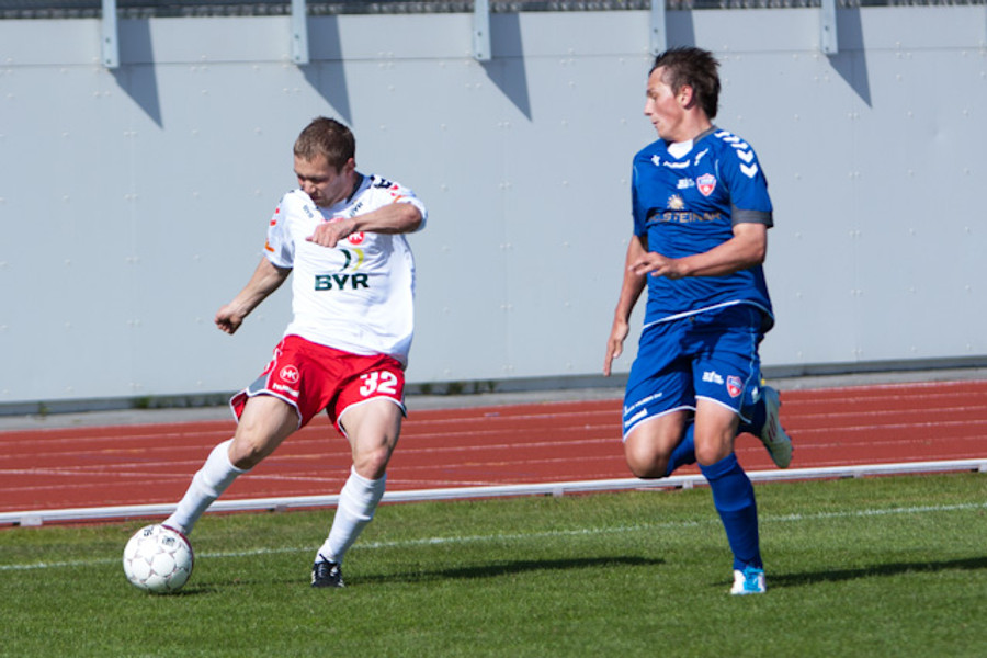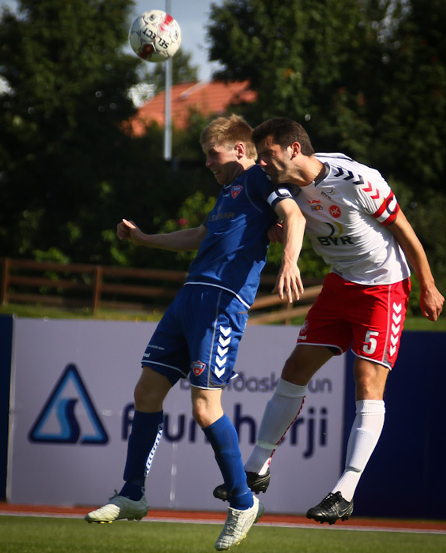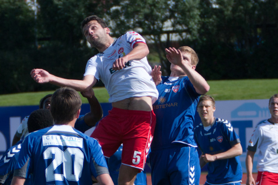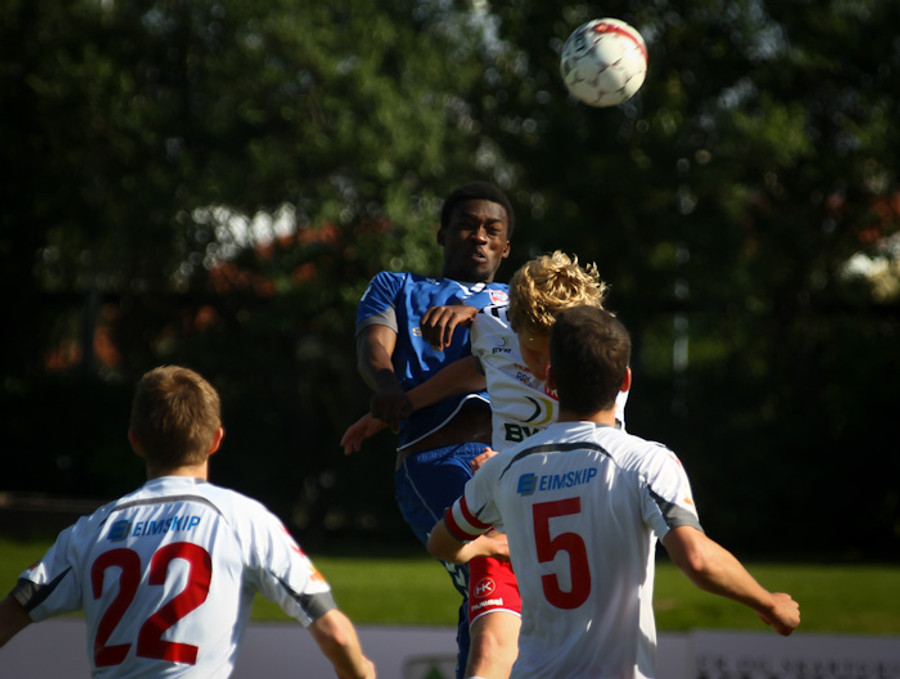 Eyþór Helgi Birgisson fékk fyrirgjöf inn í teiginn og var einn gegn Þórði Ingasyni en skallaði beint á hann.