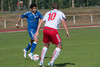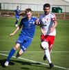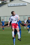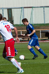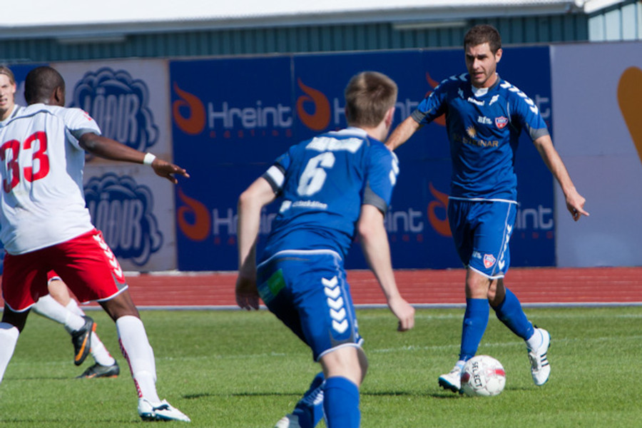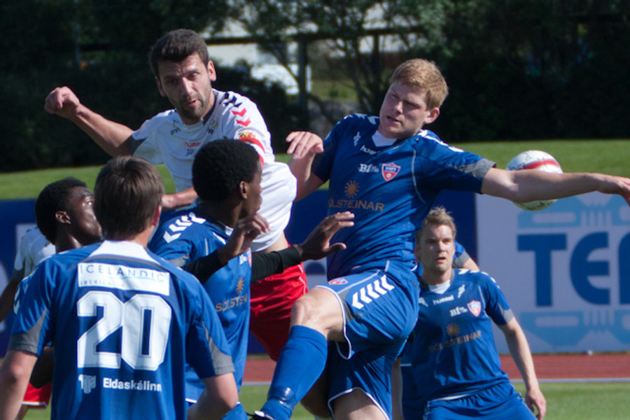 Hafsteinn Briem fær áminningu fyrir að brjóta á Nicholas Deverdics miðjumanni BÍ/Bolungarvíkur á miðjum vallarhelmingi gestanna.