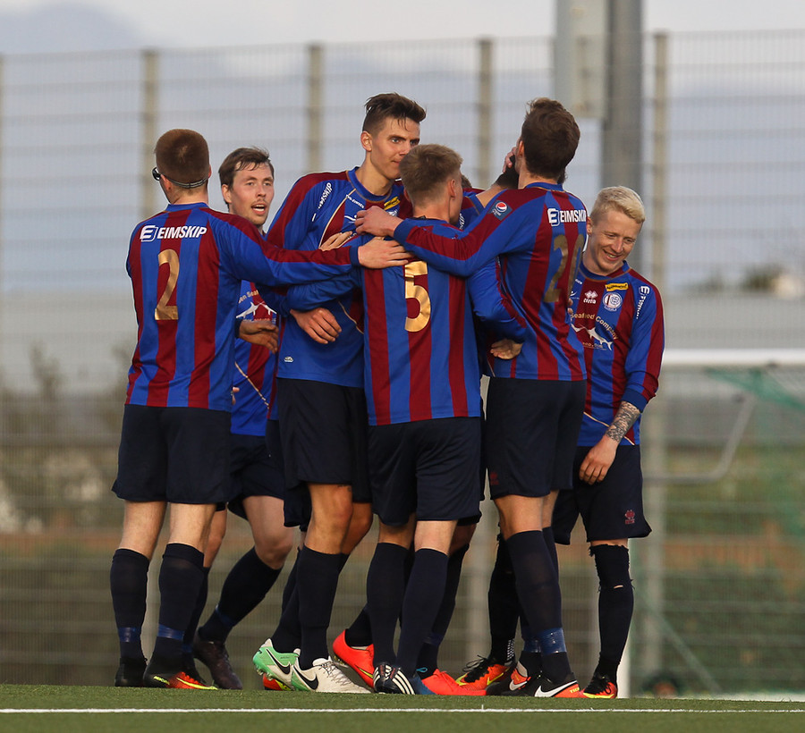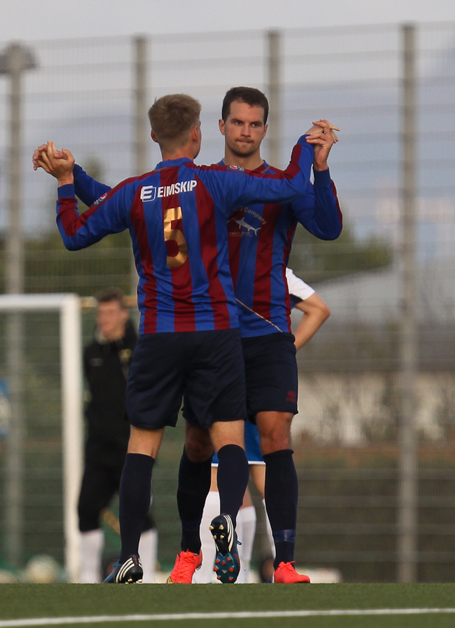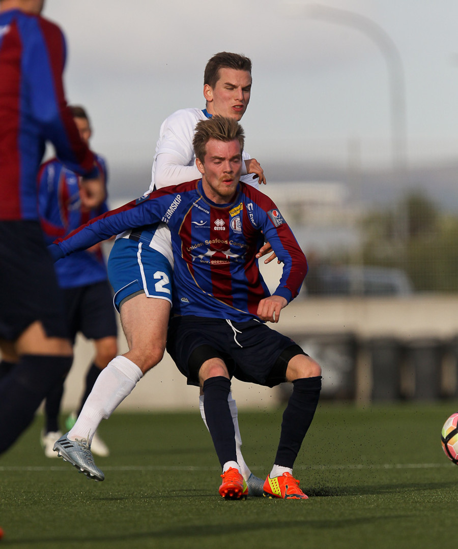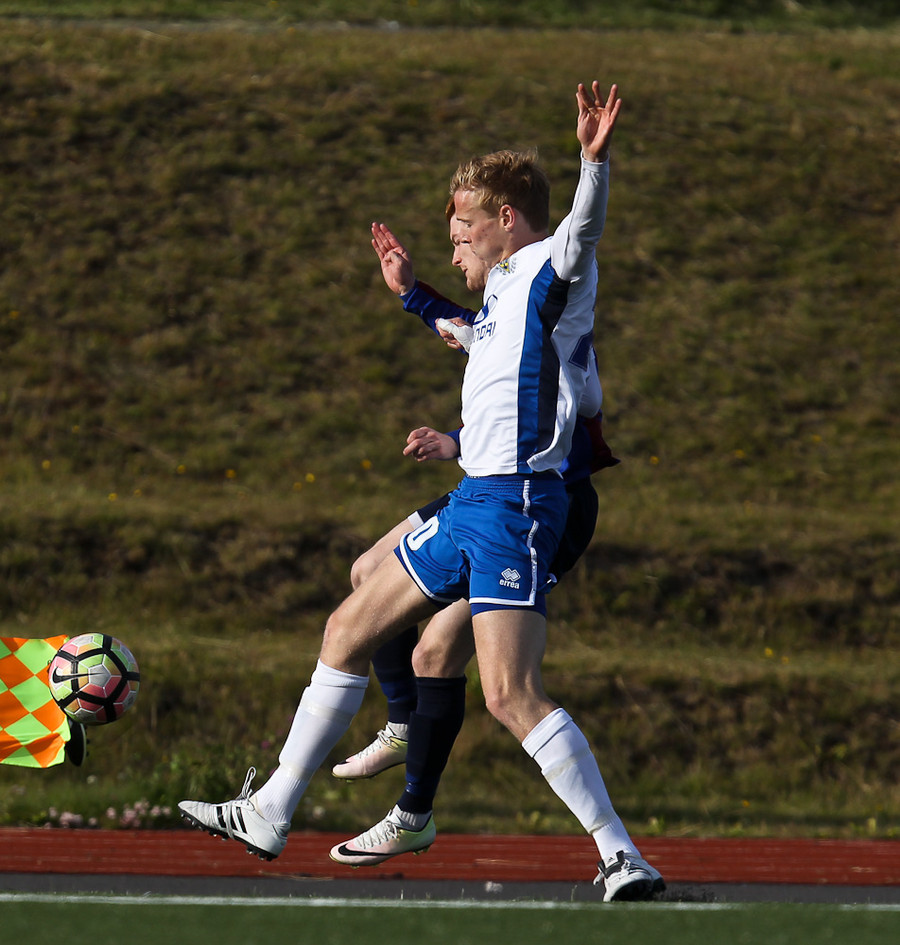MAAARK! Leiknir að komast yfir! Tómas Óli Garðarsson skorar stöngin inn úr þröngu færi.
