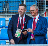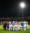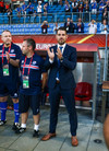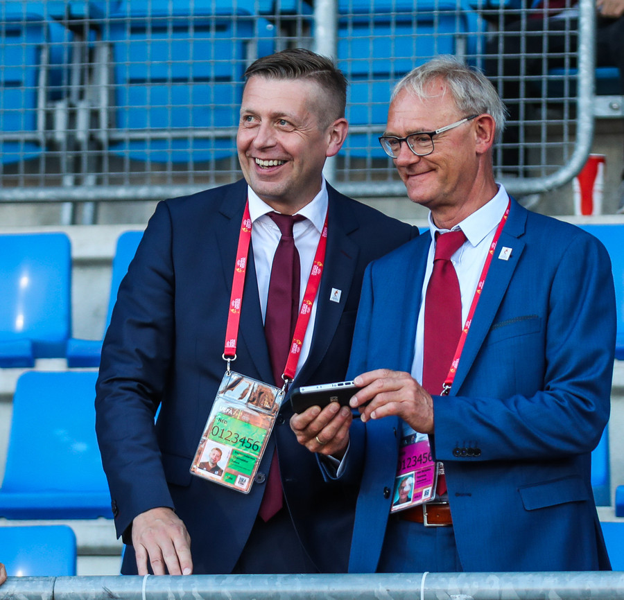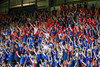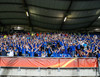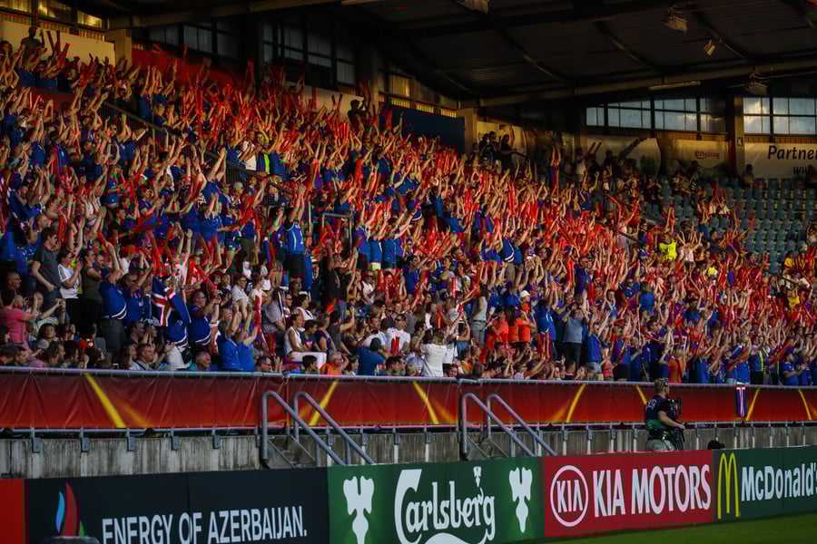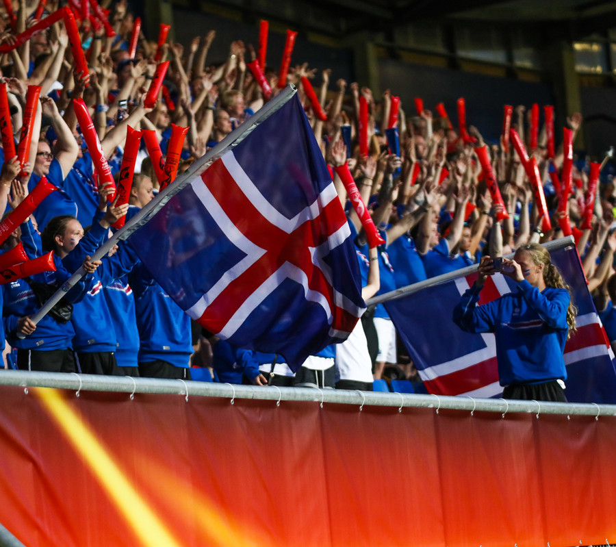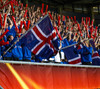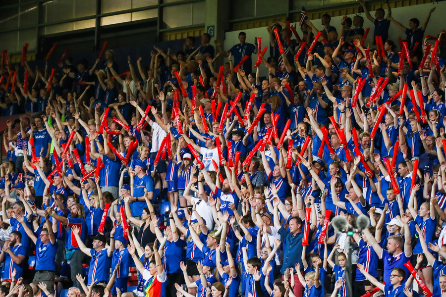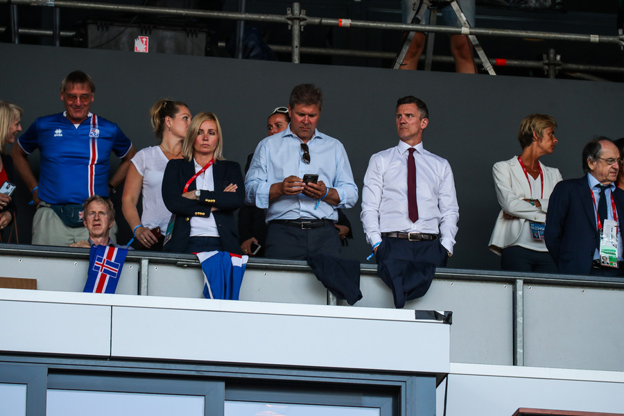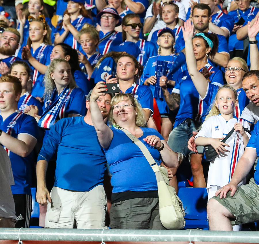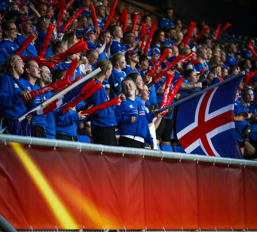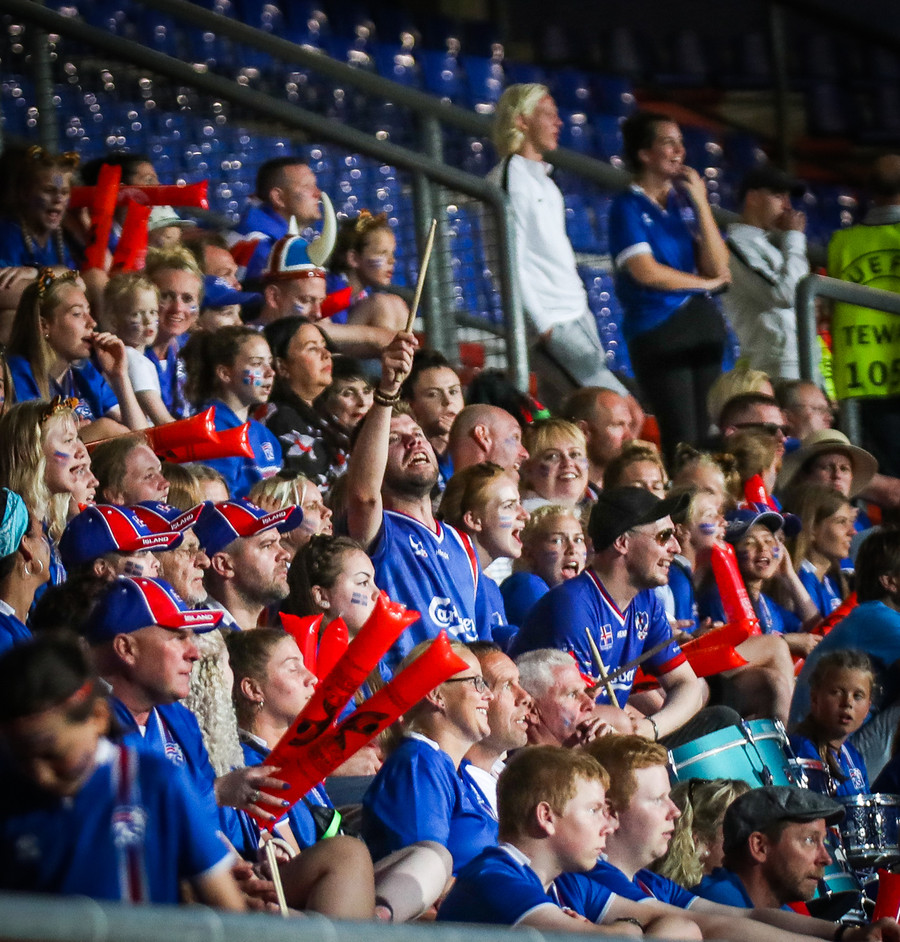 Þjóðsöngvarnir að baki. Þeir voru frekar misheppnaðir svo ekki sé annað sagt. Stuðningsmenn Íslands voru að hrópa "Áfram Ísland!" þegar sá íslenski fór af stað. Fólk var ekki alveg að átta sig. Þegar franski þjóðsöngurinn var spilaður heyrðist svo svakalegt ískur.