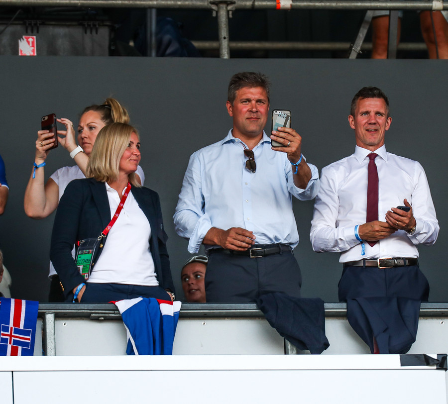 Hér í fréttamannastúkunni er fagnað í hvert sinn sem Frakkar skjóta en hitta ekki á markið. Gunnhildur Yrsa átti glæsilega tæklingu rétt áðan og kom í veg fyrir skot.