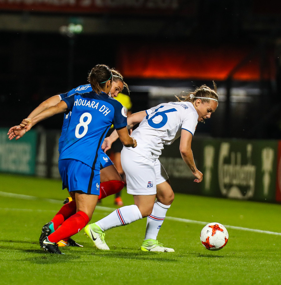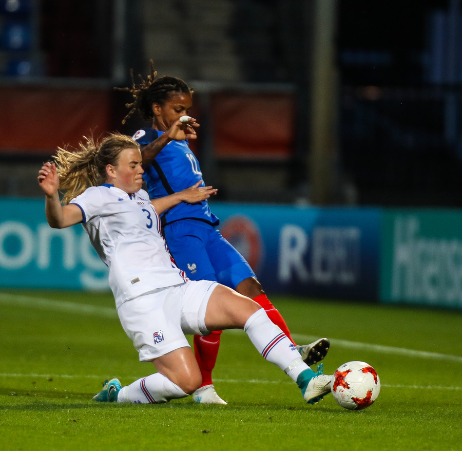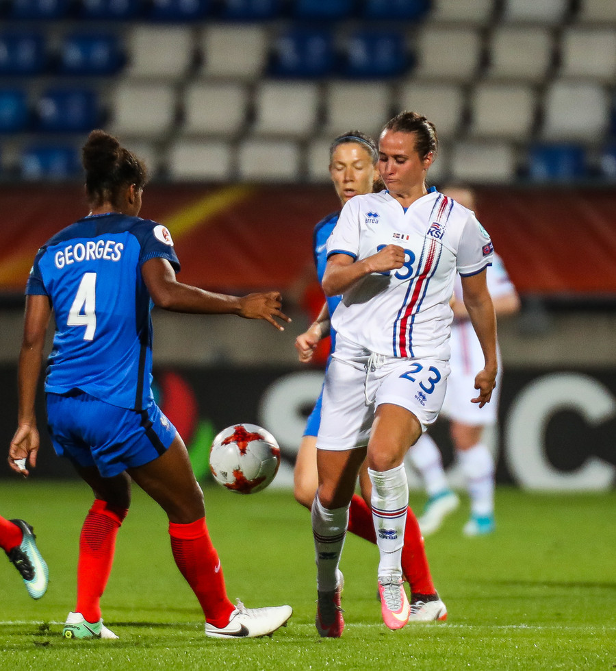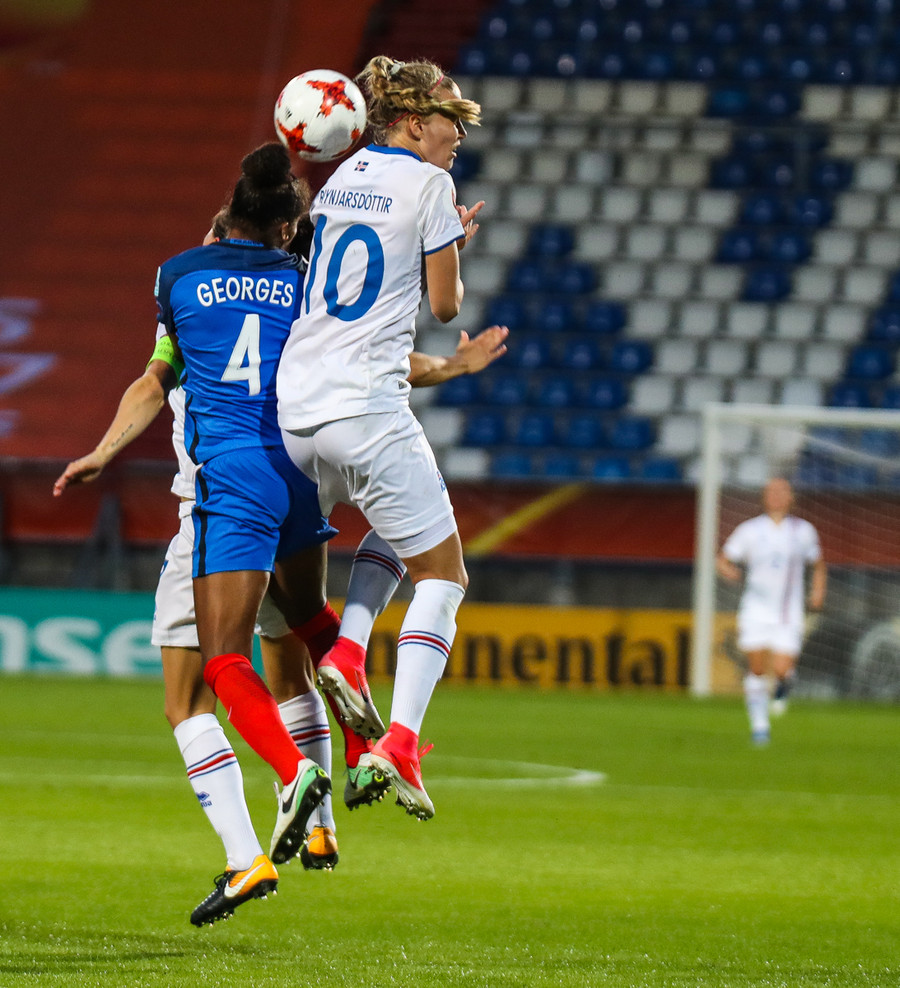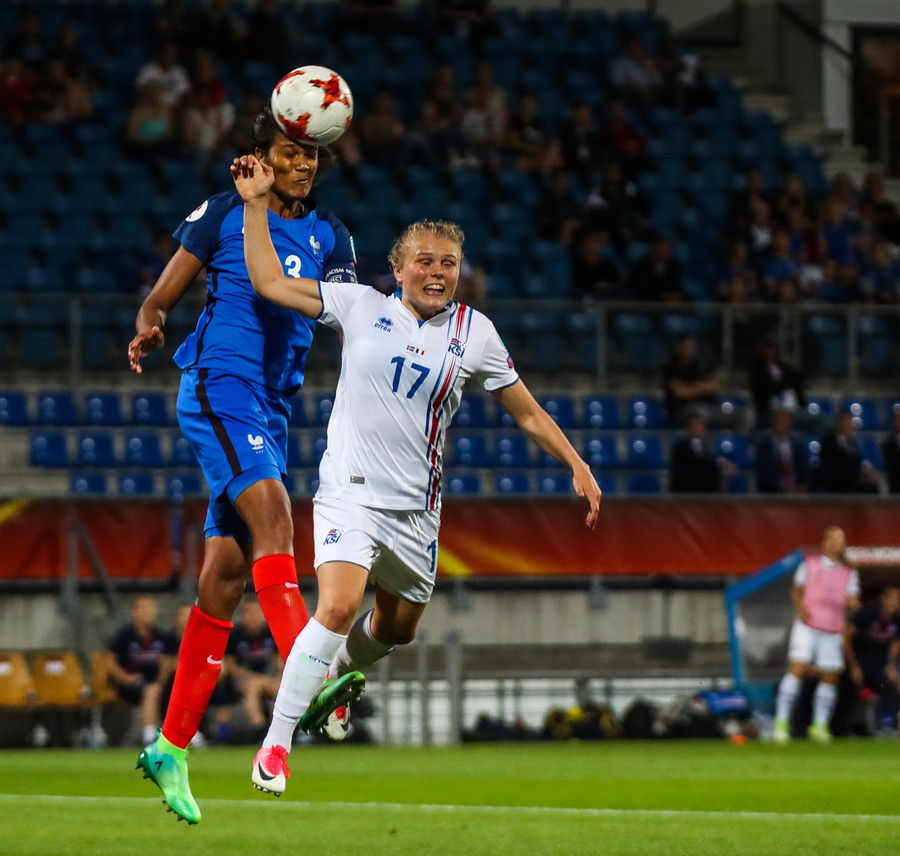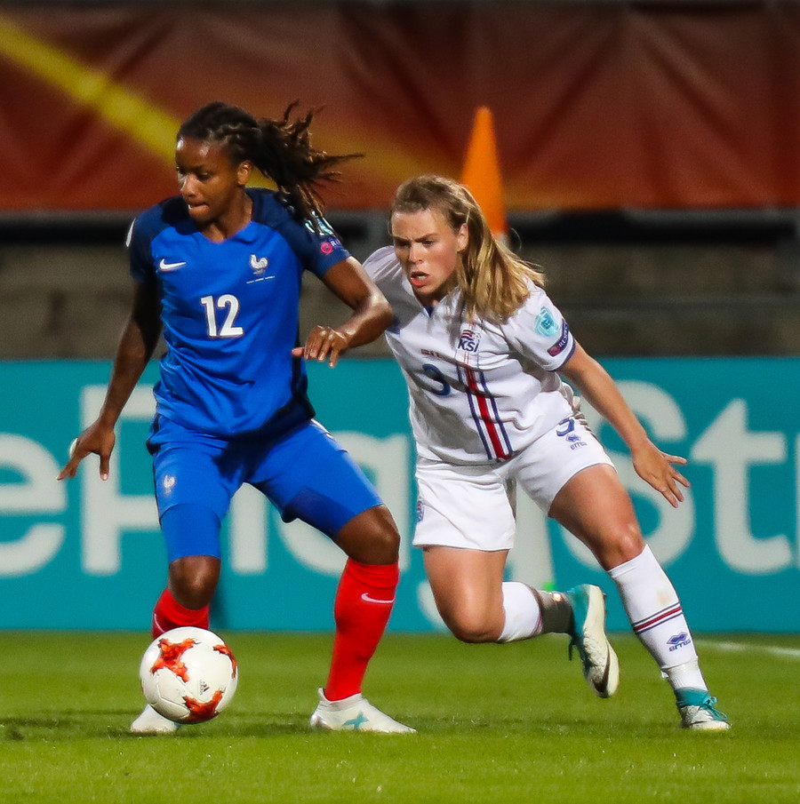 Gunnhildur Yrsa með góða vörn og kemur boltanum í hornspyrnu sem Frakkarnir fá.