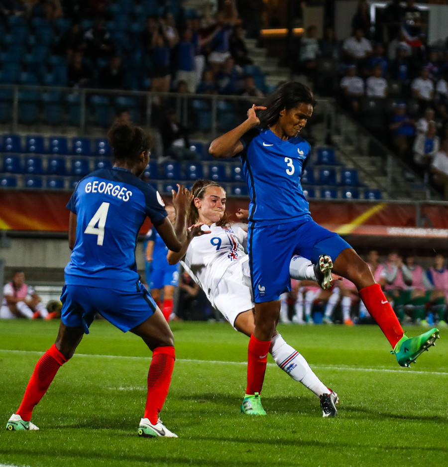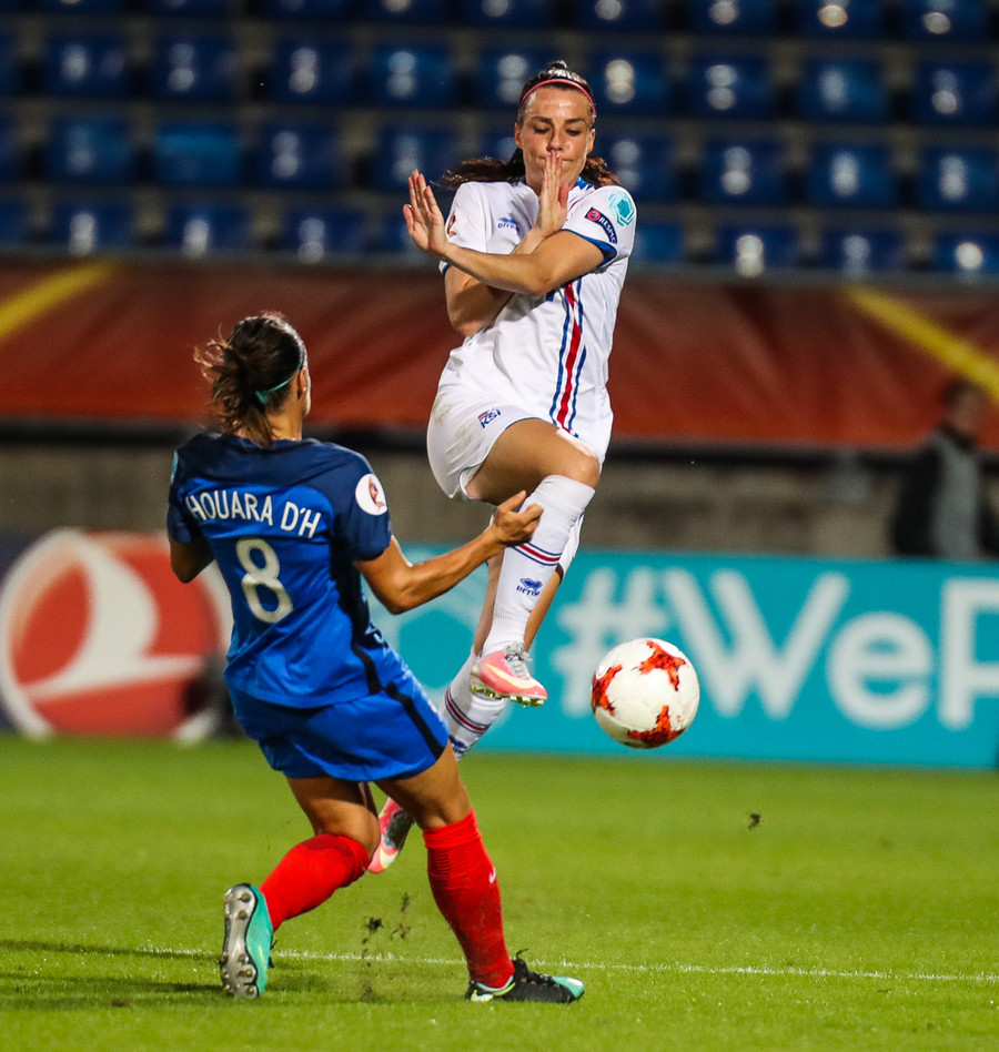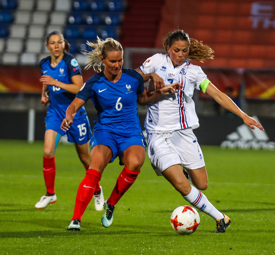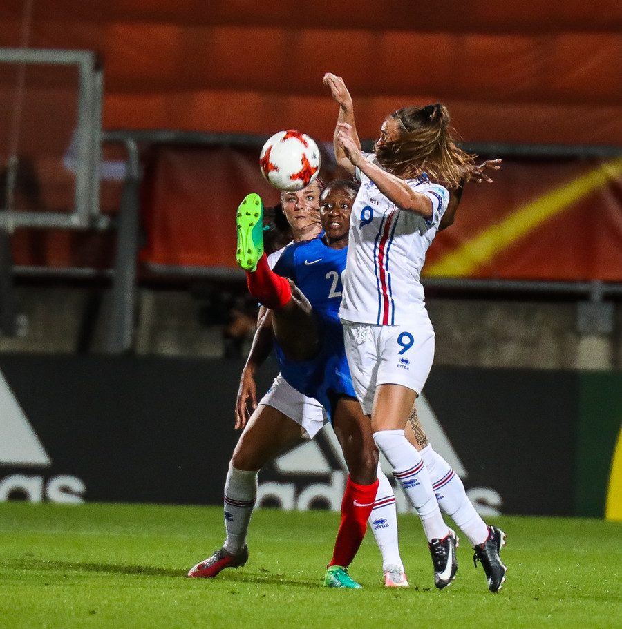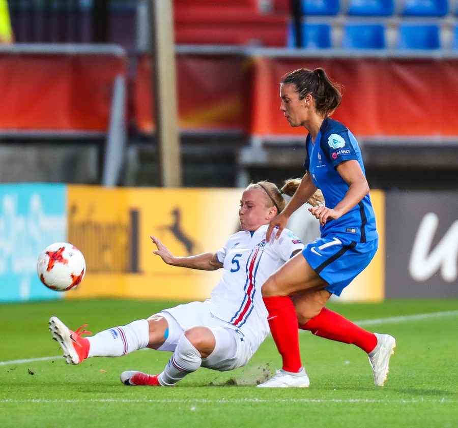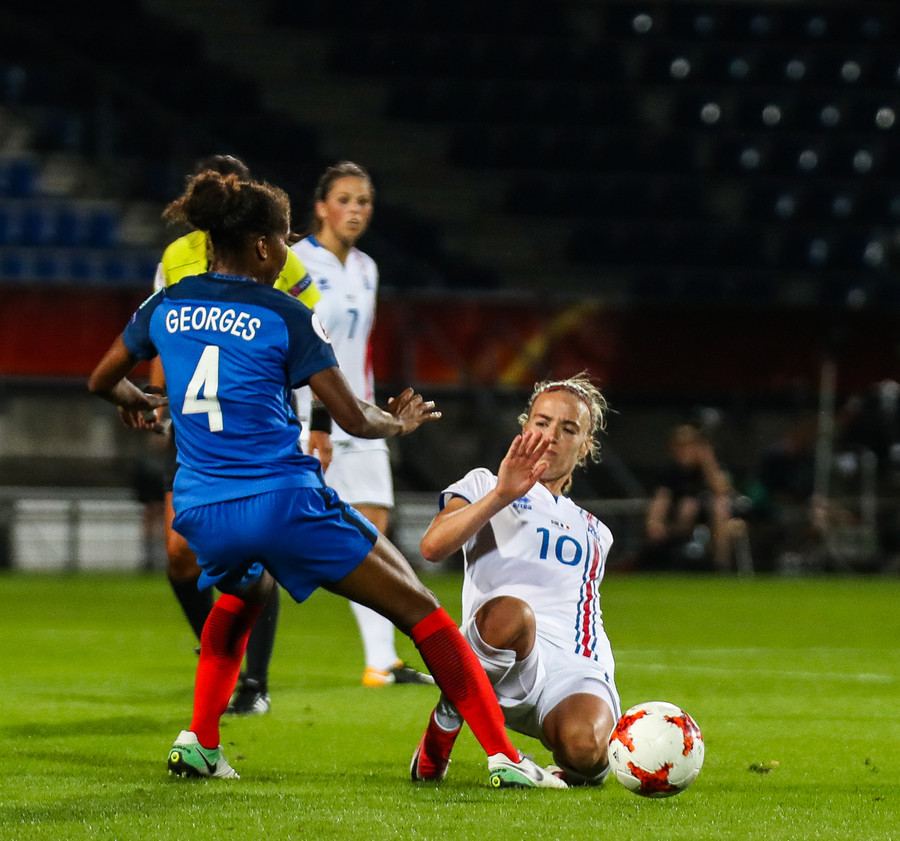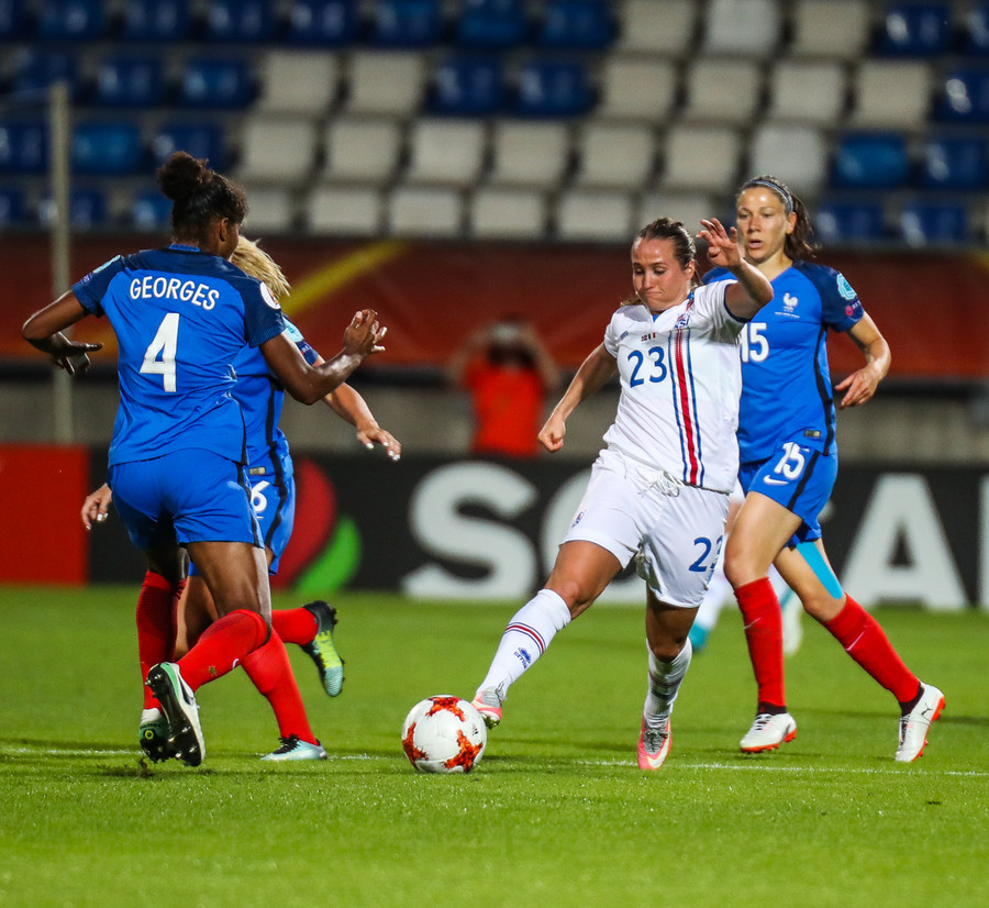 Gunnhildur Yrsa með góða vörn og kemur boltanum í hornspyrnu sem Frakkarnir fá.