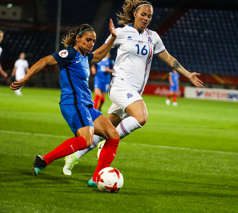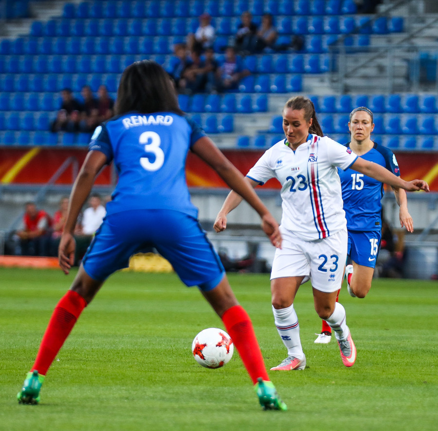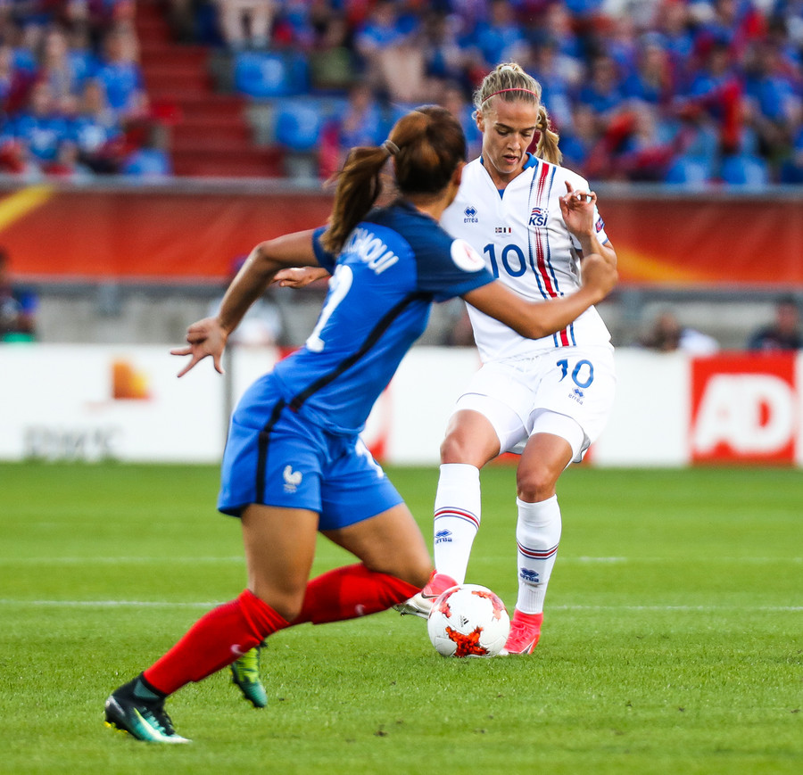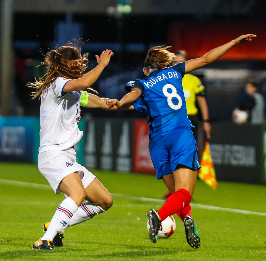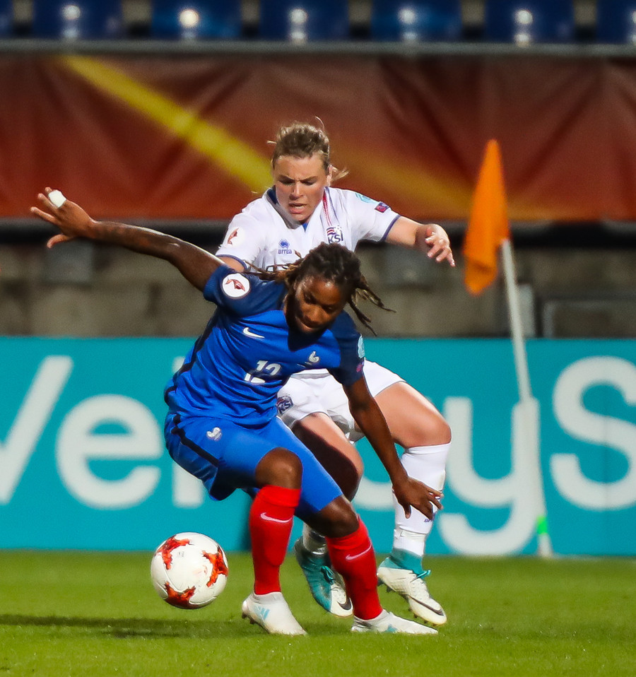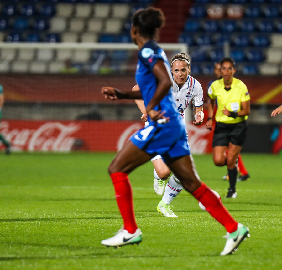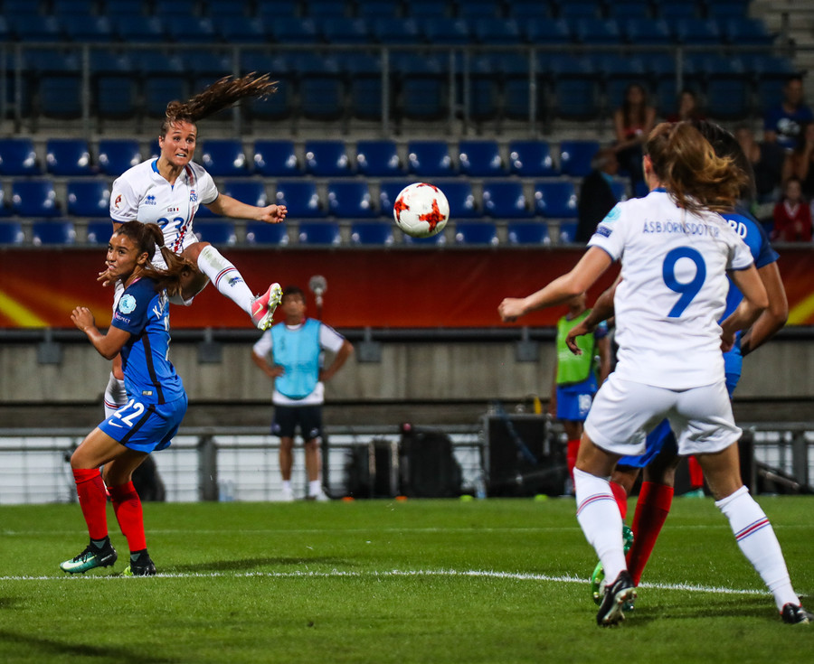 Gunnhildur Yrsa með góða vörn og kemur boltanum í hornspyrnu sem Frakkarnir fá.