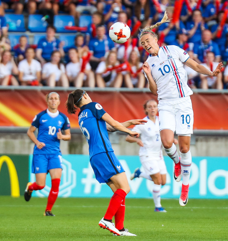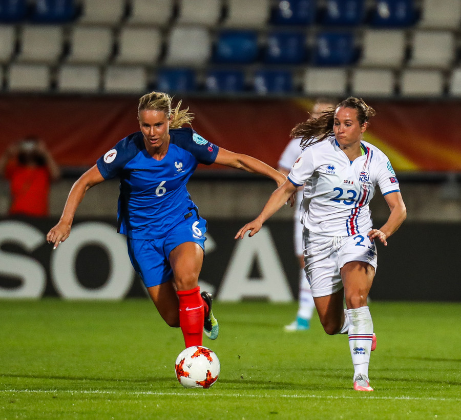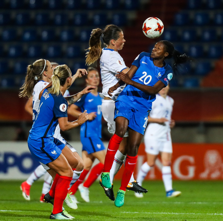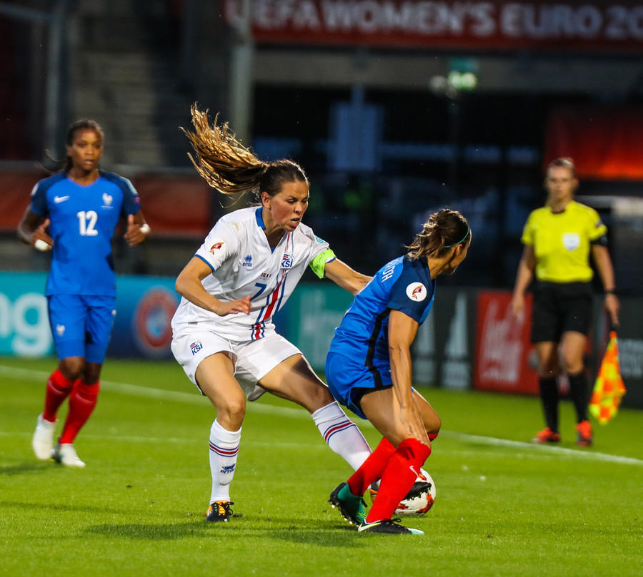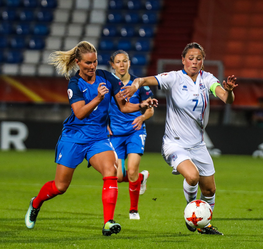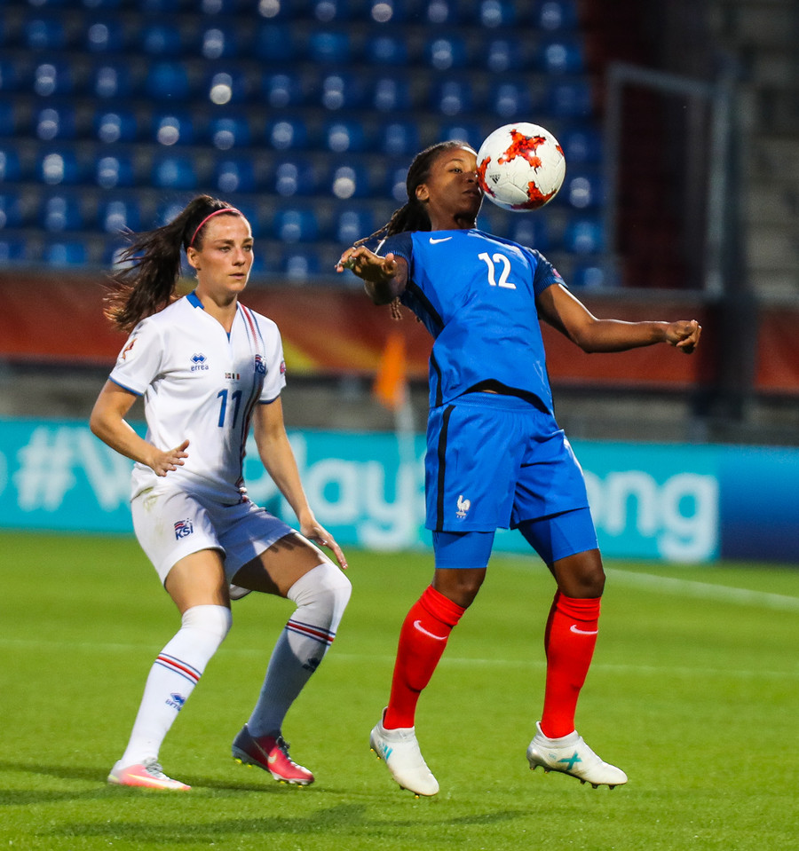 Gunnhildur Yrsa með góða vörn og kemur boltanum í hornspyrnu sem Frakkarnir fá.
