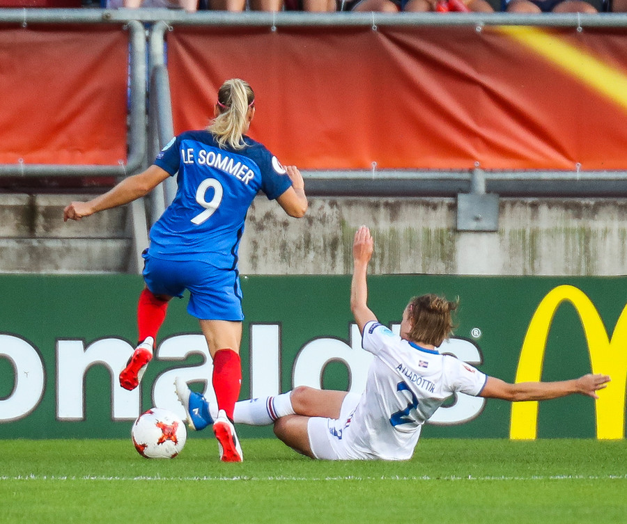 Frakkar með stórhættulega stungusending á Sommer en Sif Atladóttir bjargaði með tæklingu upp á 10! Þvílík tækling!