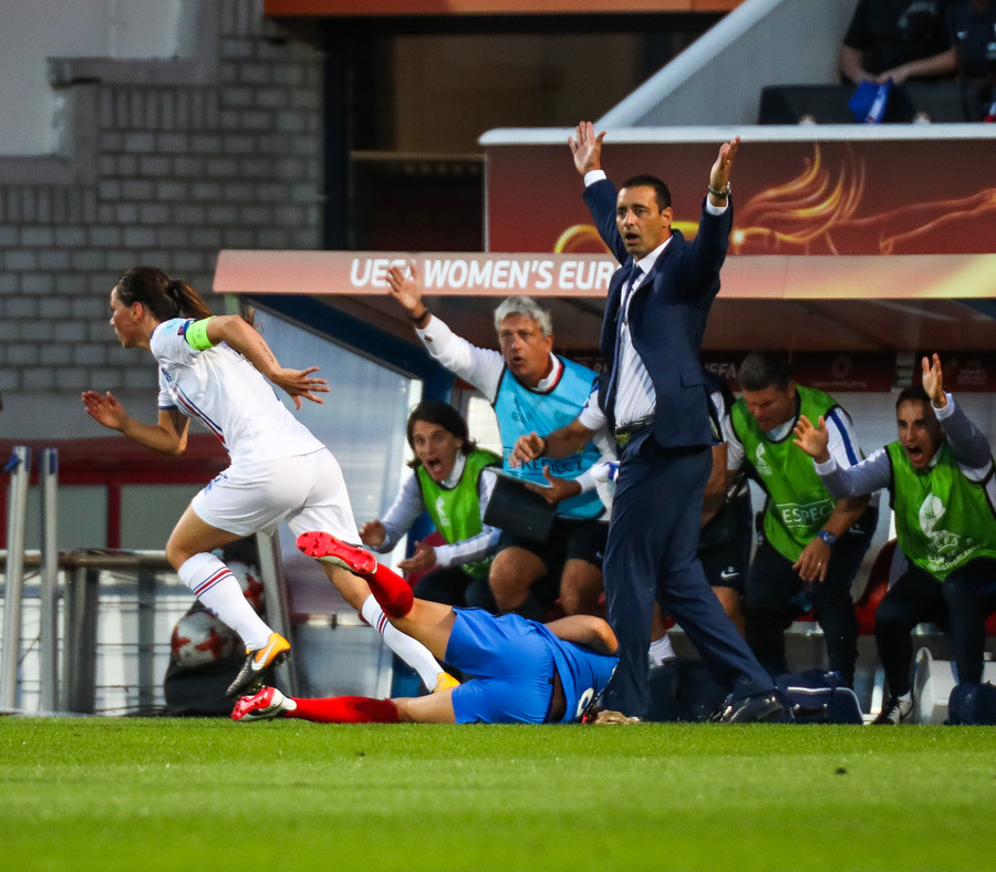SLÁIN!!! Wendie Renard með skalla í slá eftir hornspyrnu. Úff.