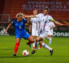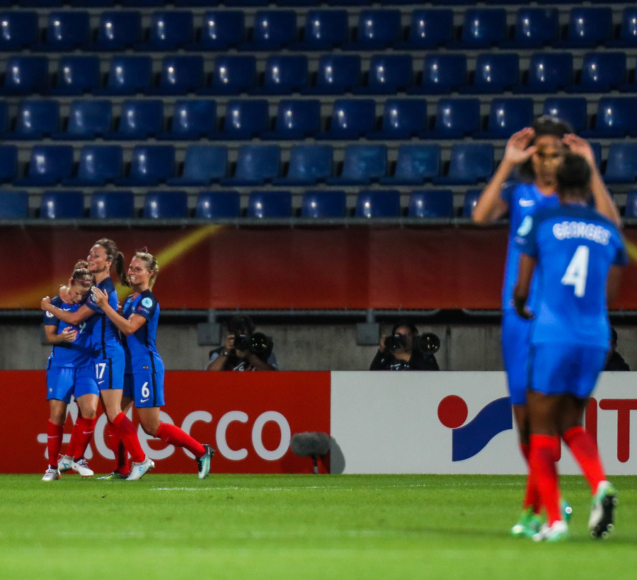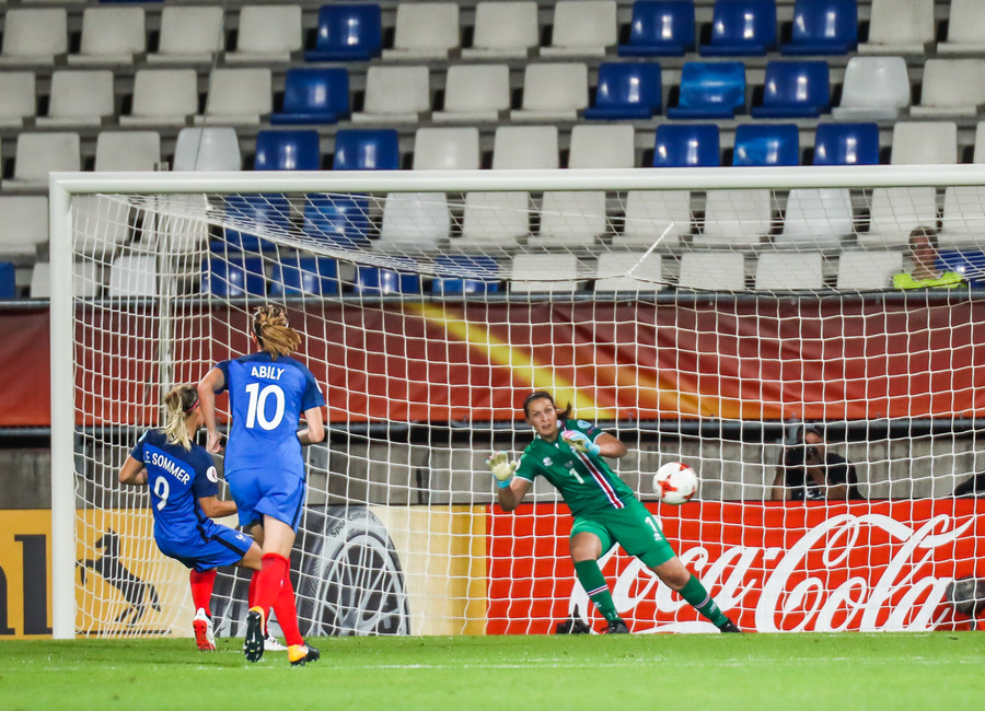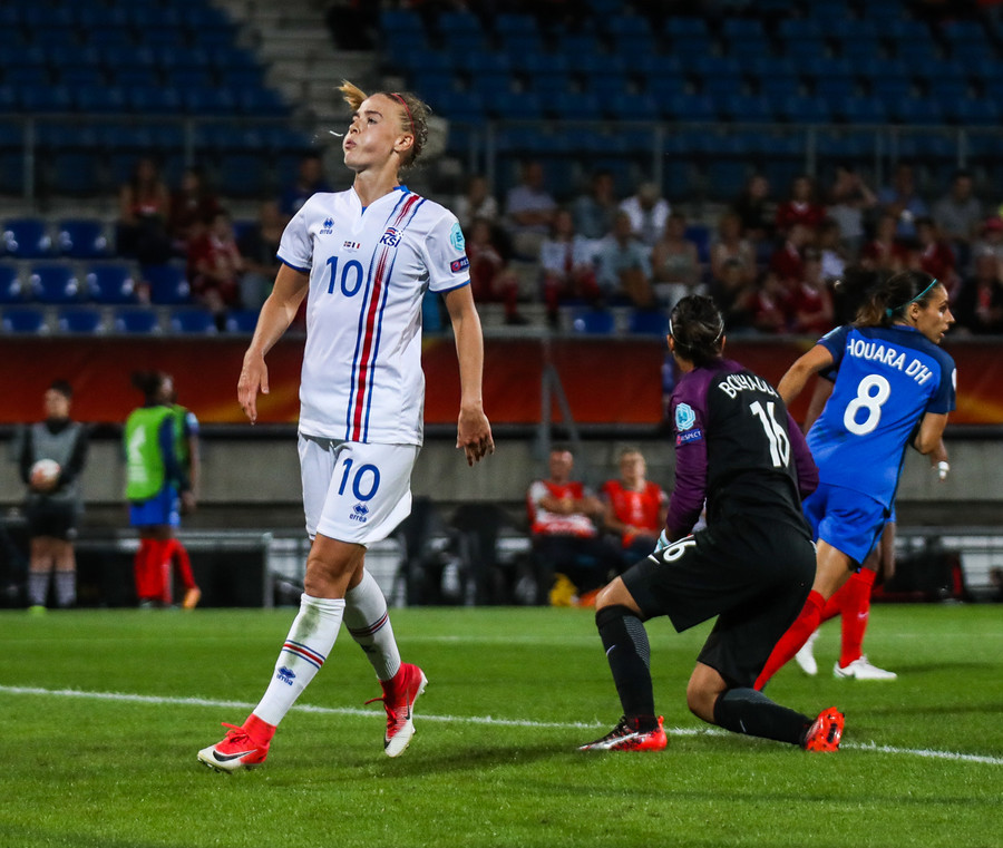 Fanndís var hársbreidd frá því að sleppa í gegn. Markvörður Frakka í skógarferð langt út úr marki sínu en Fanndís náði ekki að koma knettinum framhjá henni. Hefði það tekist hefði leiðin að markinu verið algjörlega greið!