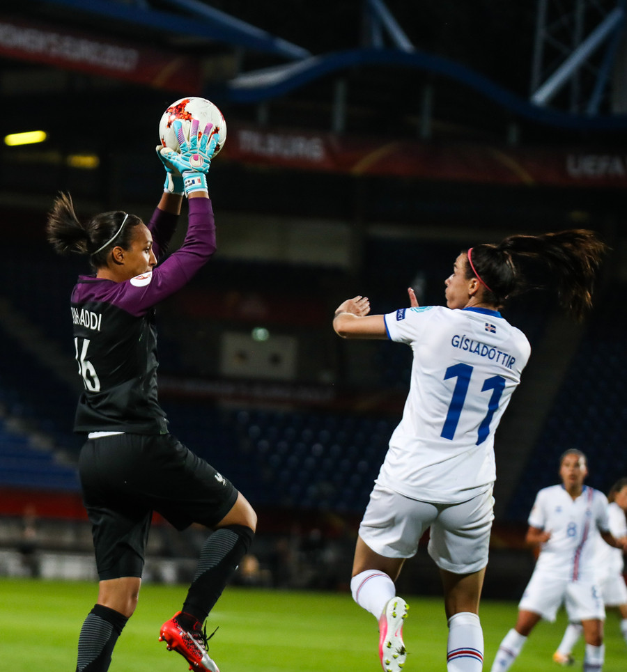Sif Atladóttir með langt innkast en þetta endar í fanginu á Bouhaddi, markverði Frakka. Ísland ekki með marga leikmenn framarlega á vellinum. Skiljanlega.