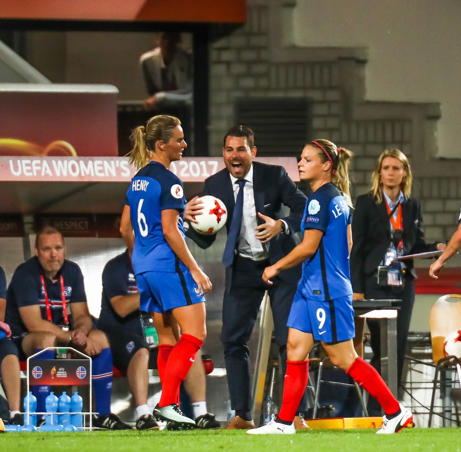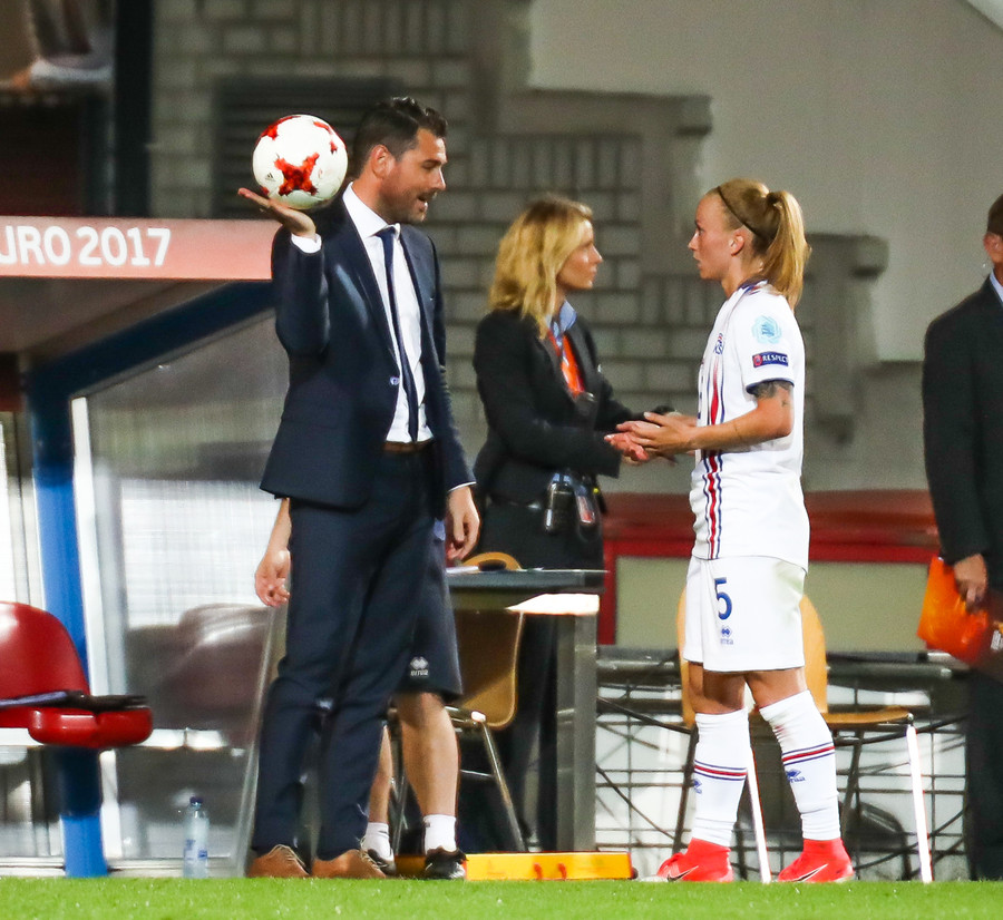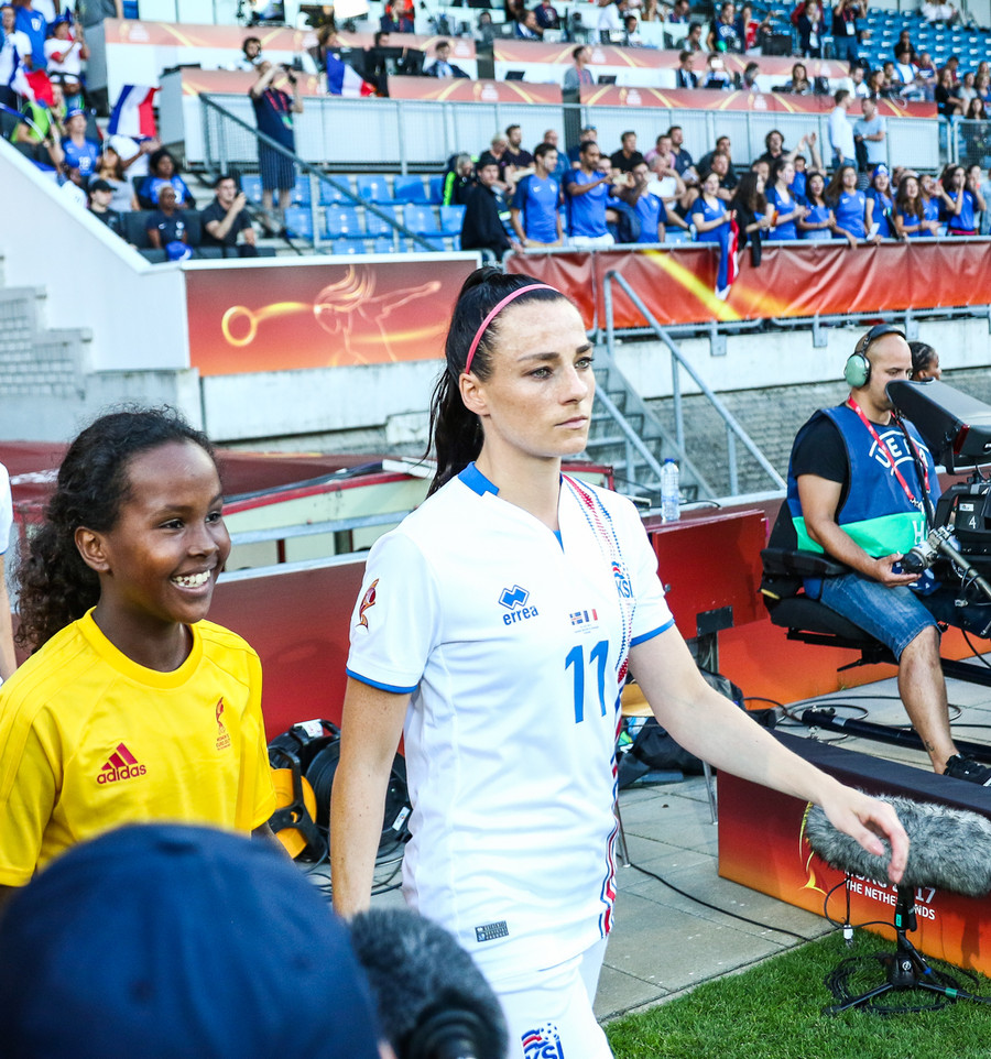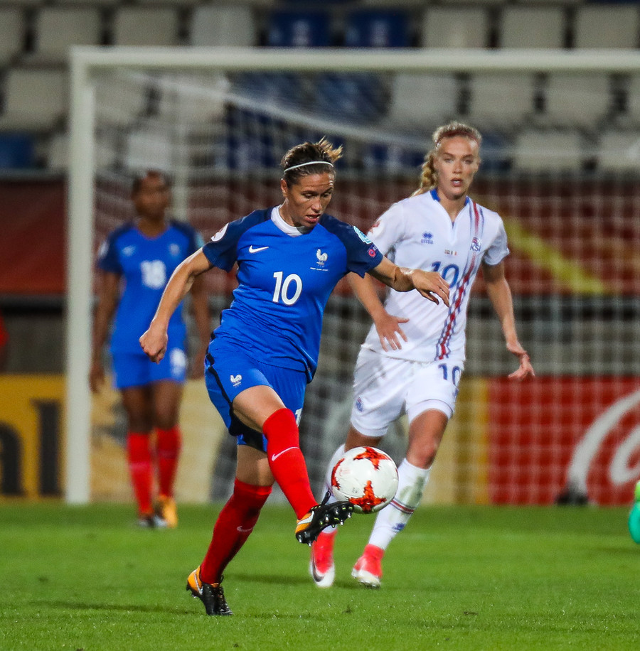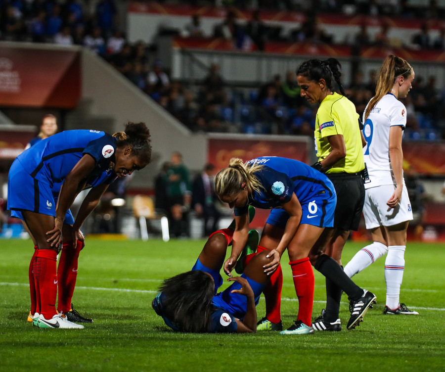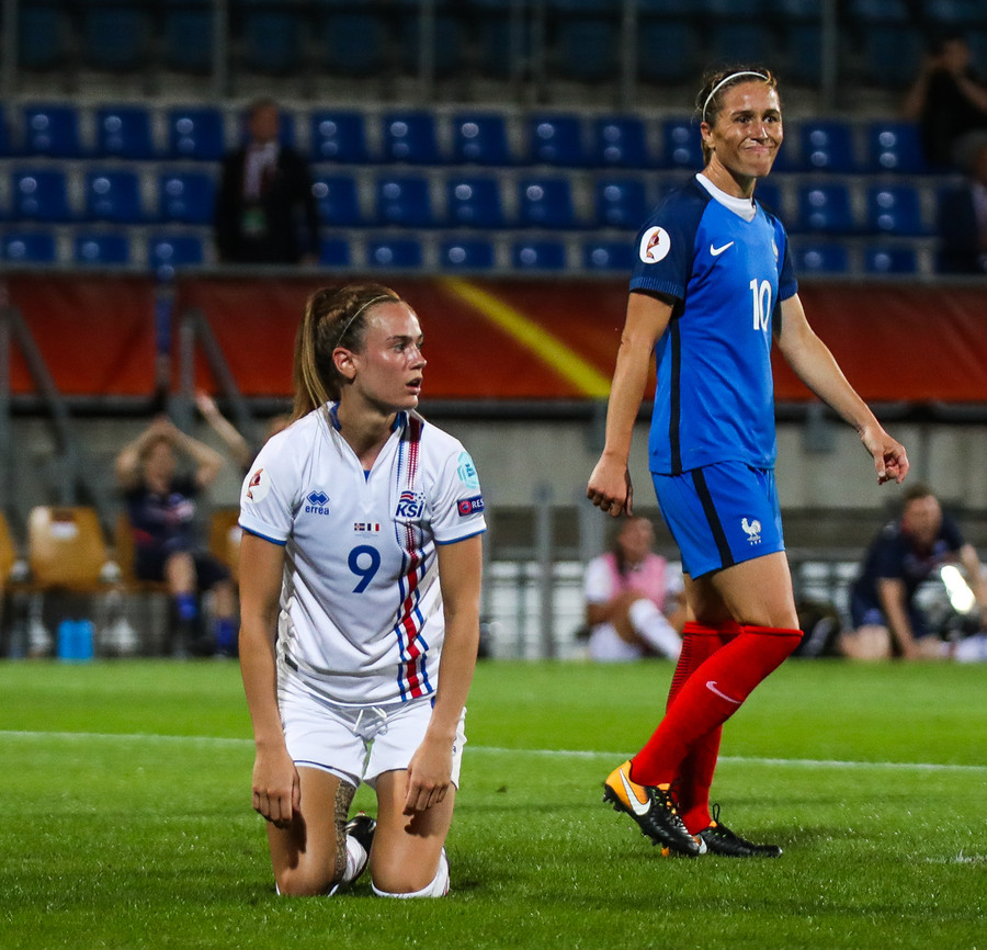 Frakkland fær vítaspyrnu. Amandine Henry fellur niður í teignum eftir fyrirgjöf... Elín Metta Jensen tók Henry niður þegar hún var nýkomin inn sem varamaður.