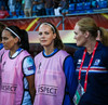 Harpa Þorsteins að gera sig klára að koma inn. Frakkar með hættulega sókn og skot á markið en Guðbjörg ver af öryggi.