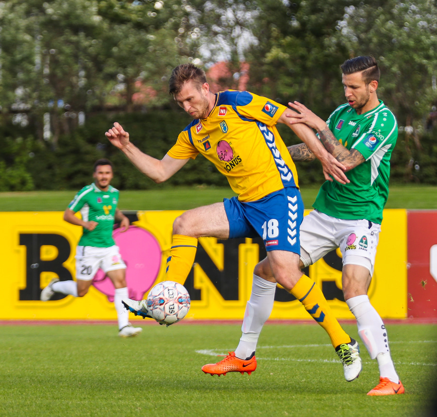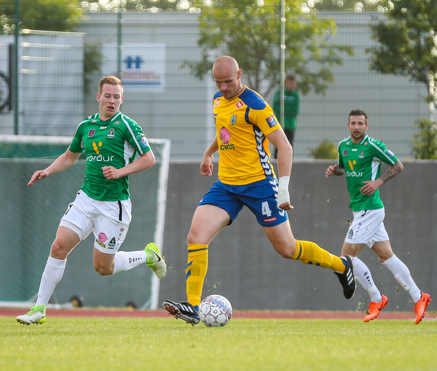 MAAAARKKKKKKK! Martin Lund Pedersen skorar á móti sínum gömlu félögum. Hann fékk flotta sendingu frá Arnþóri Ara og skaut föstu og hnitmiðuðu skoti í hægra markhornið niðri.