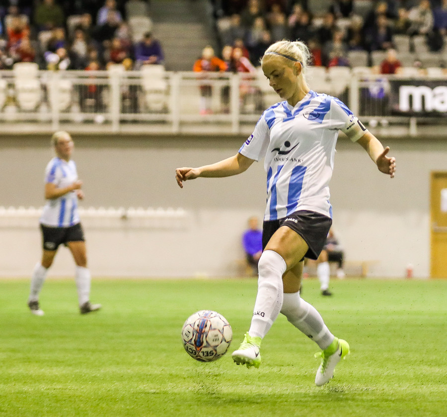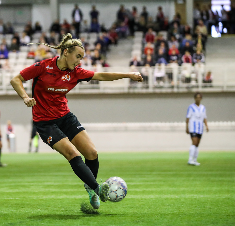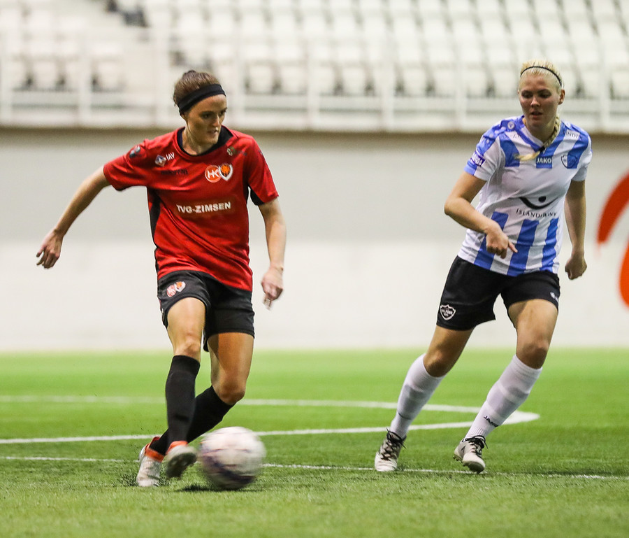 Þær fá dæmda aukaspyrnu hægra megin við vítateig HK/Víkings. Anna María setur fastan bolta fyrir markið þar sem Kristrún mætir ákveðin en skallar yfir.