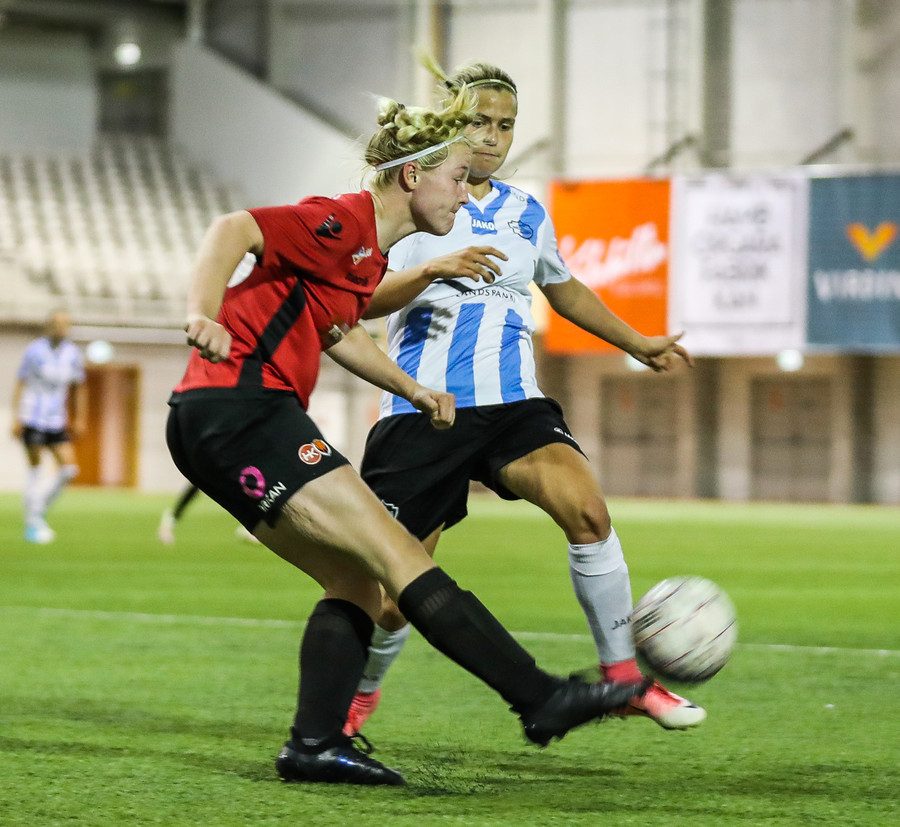 Staðan er orðin 1-0 fyrir HK/Víkingum. Chante mistókst að halda fyrirgjöf frá vinstri og missti boltann undir pressu frá Karólínu Jack. Boltinn datt niður við markið en Karólína var úr jafnvægi og of langt frá til að nýta mistökin.