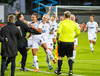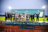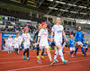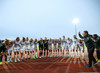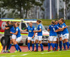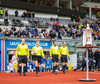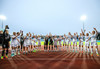Liðin er komin inná völlinn og stilla sér upp. Hér er verið að heilsa einhverju einvalaliði með handabandi áður en þetta getur allt saman farið í gang.