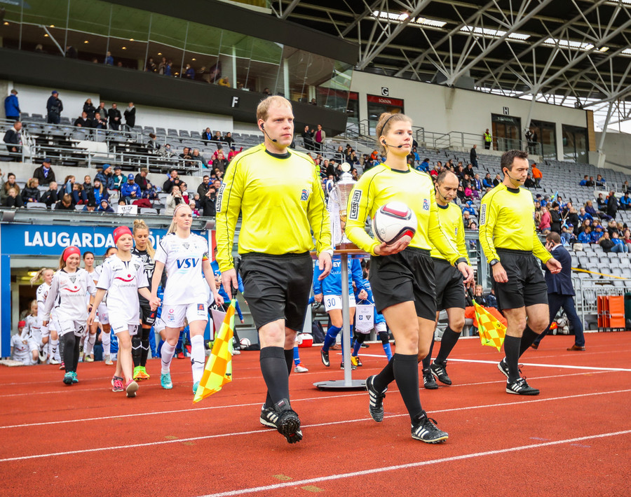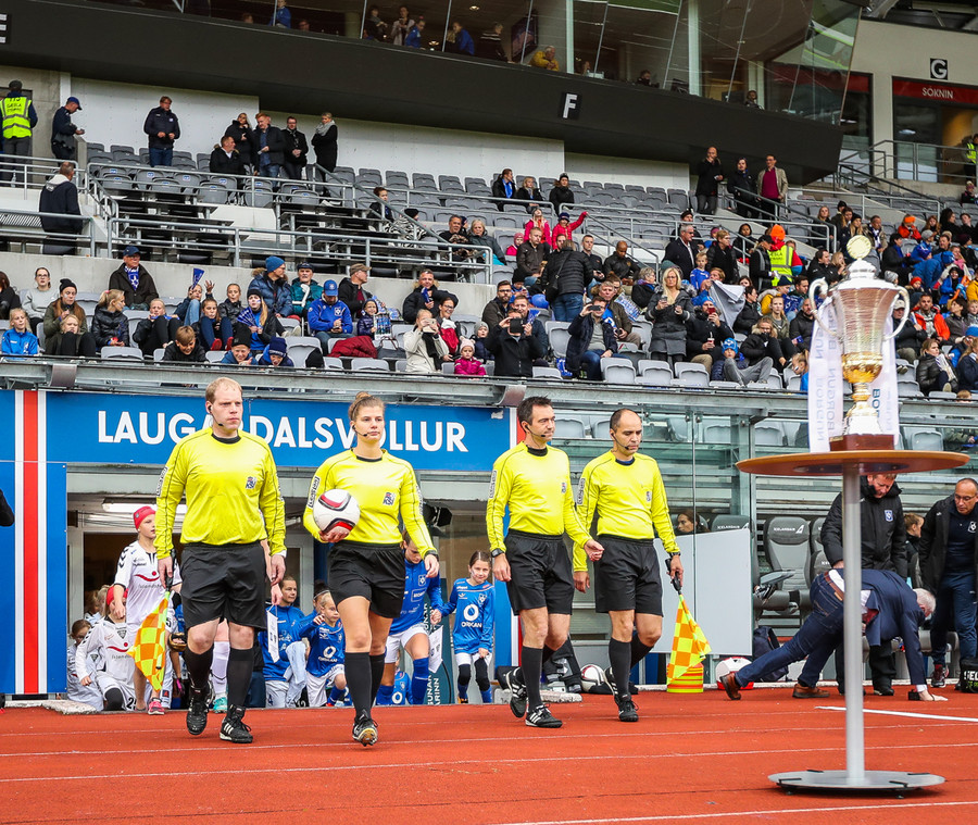 Nú þessi leikur hér í dag fer í sögubækurnar þar sem þetta verður fyrsti úrslitaleikur bikarkeppninnar þar sem kona dæmir. Bríet Bragadóttir mun dæma leikinn og henni til aðstoðar verða Eðvarð Eðvarsson og Gunnar Helgason.