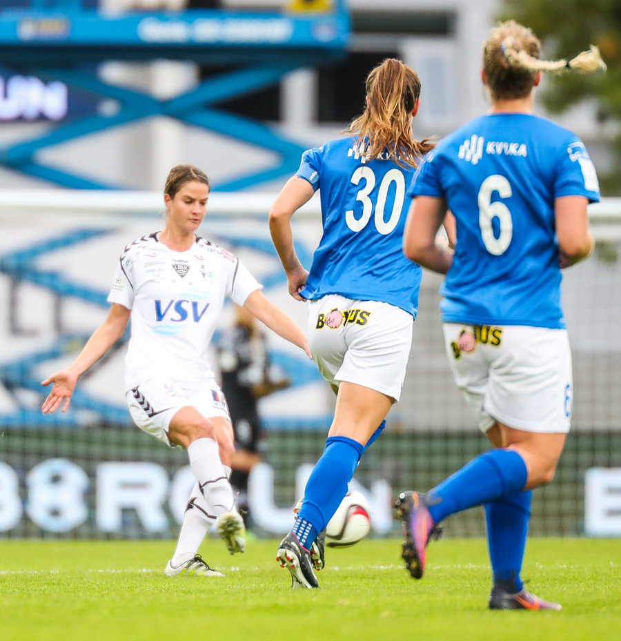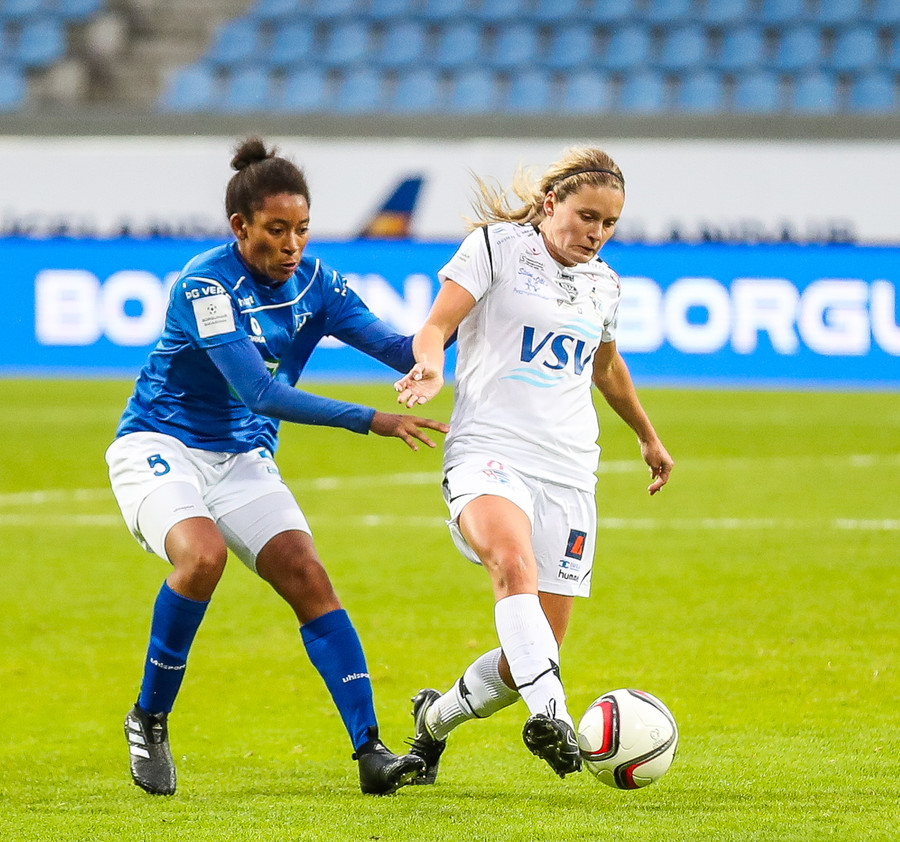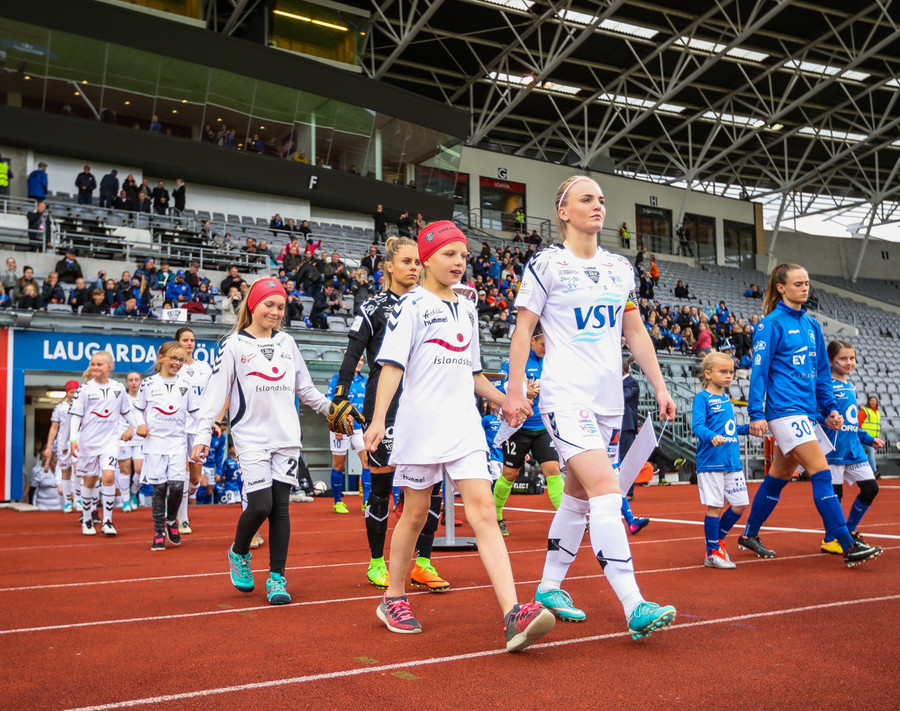 VEISLAN ER HAFIN! Stjarnan byrjar með boltann og þær sækja í átt að Laugardalslauginni.