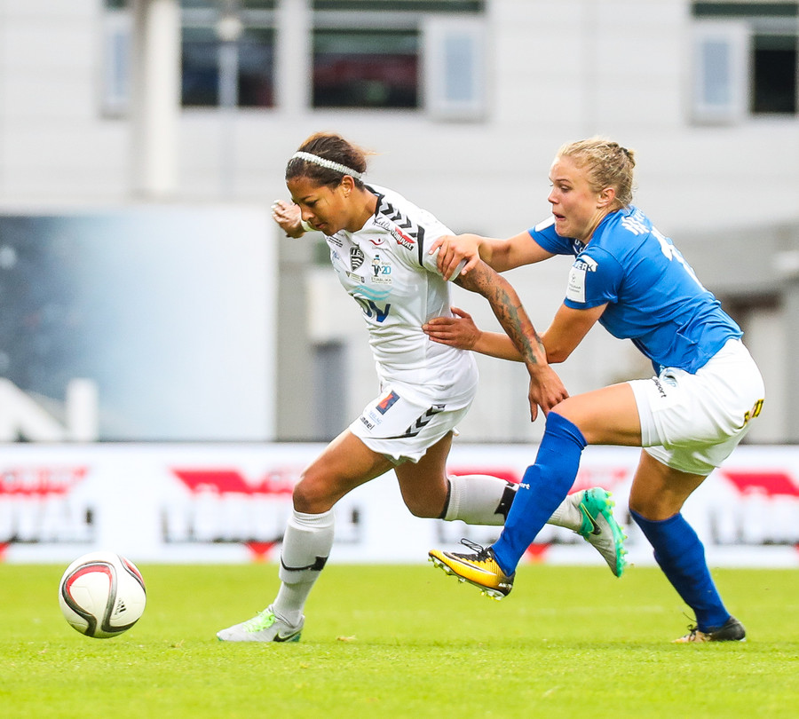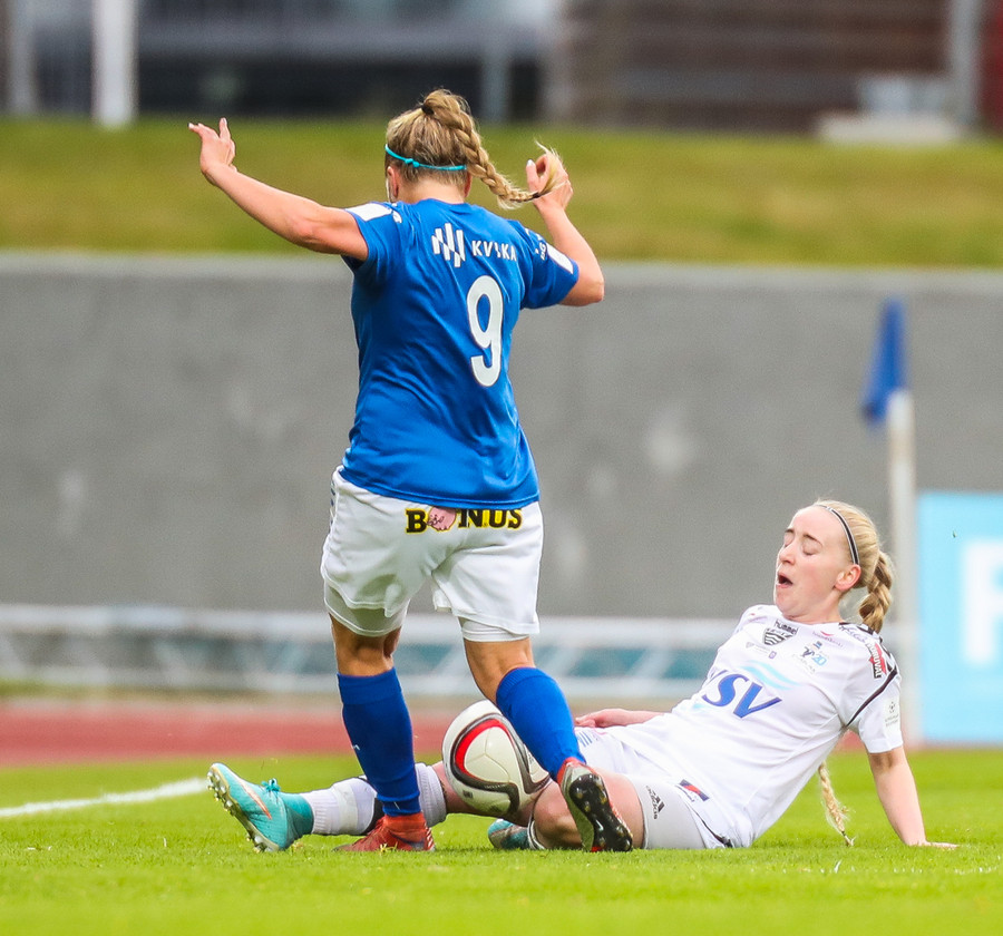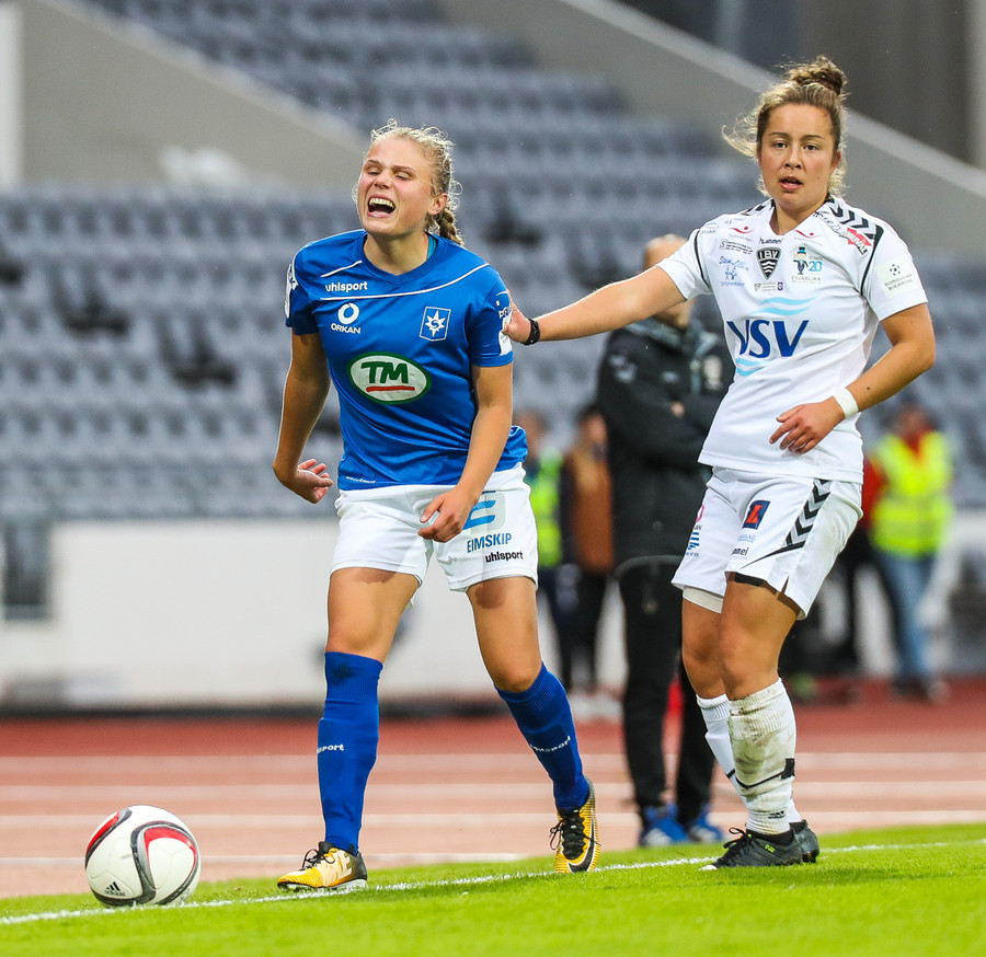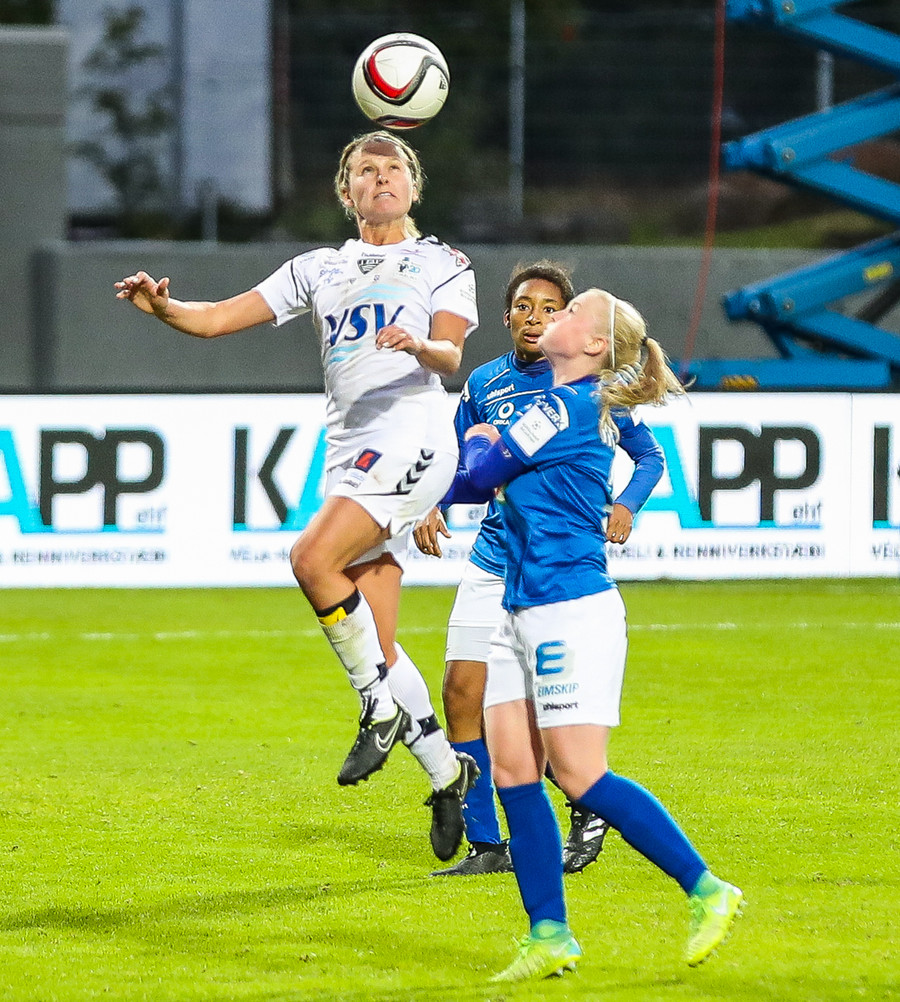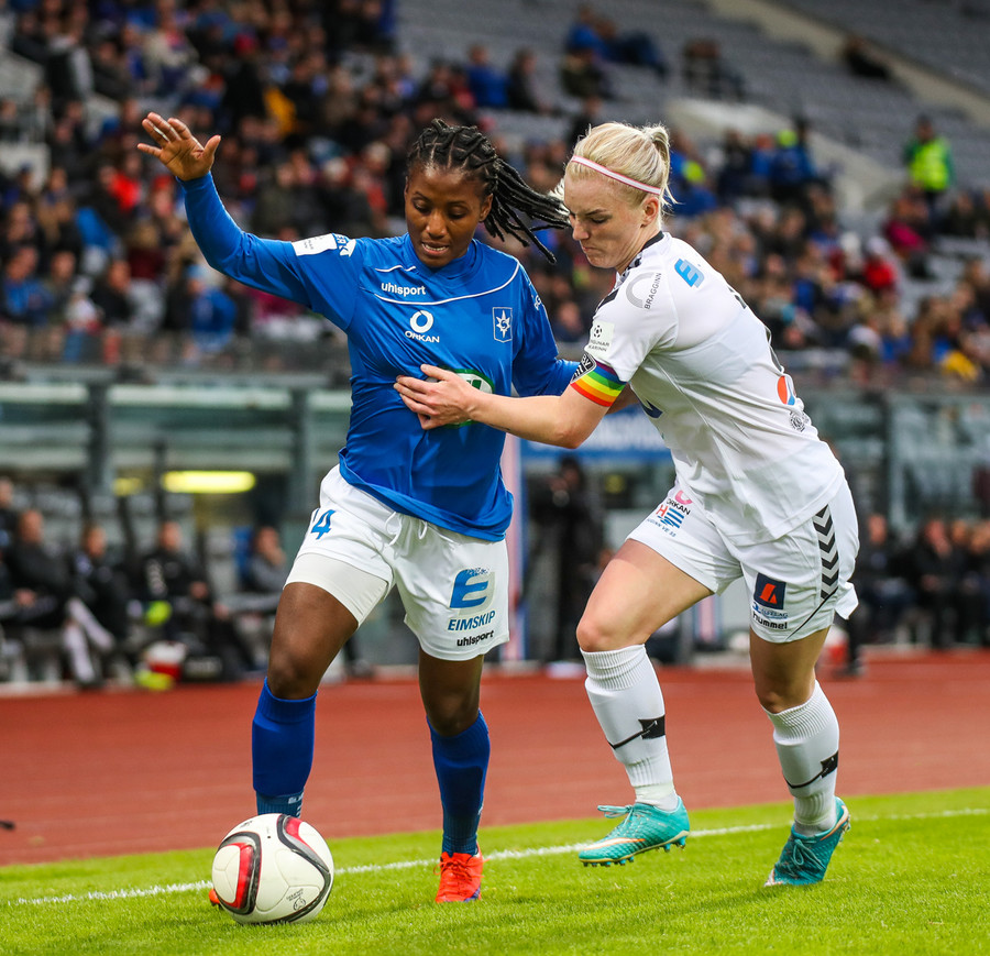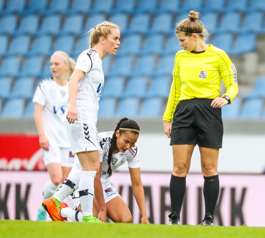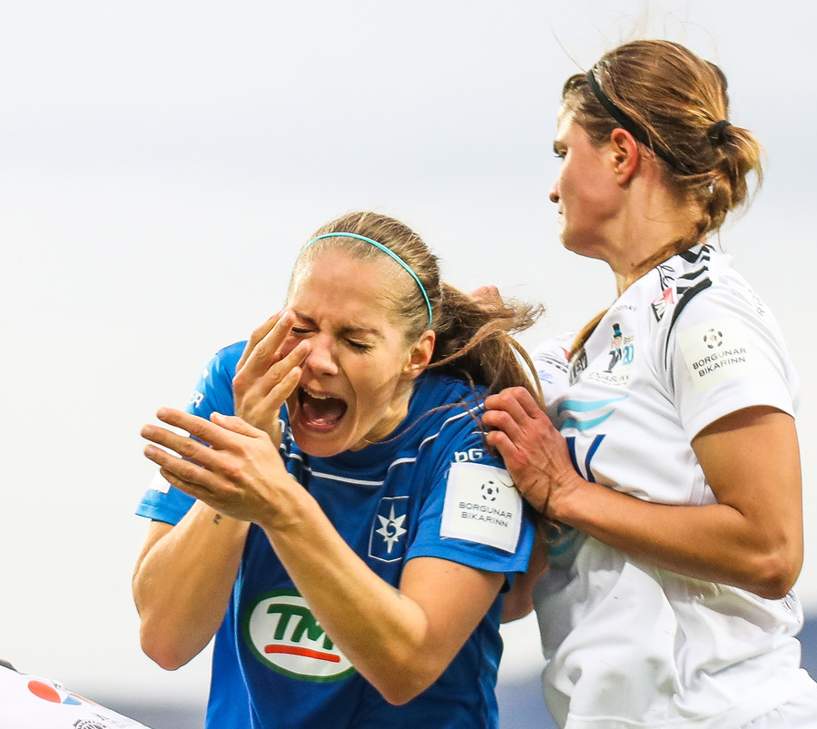 Ana Cate brýtur harkalega á Sísí inná miðsvæðinu eftir að hafa átt slaka sendingu fram völlinn.
