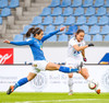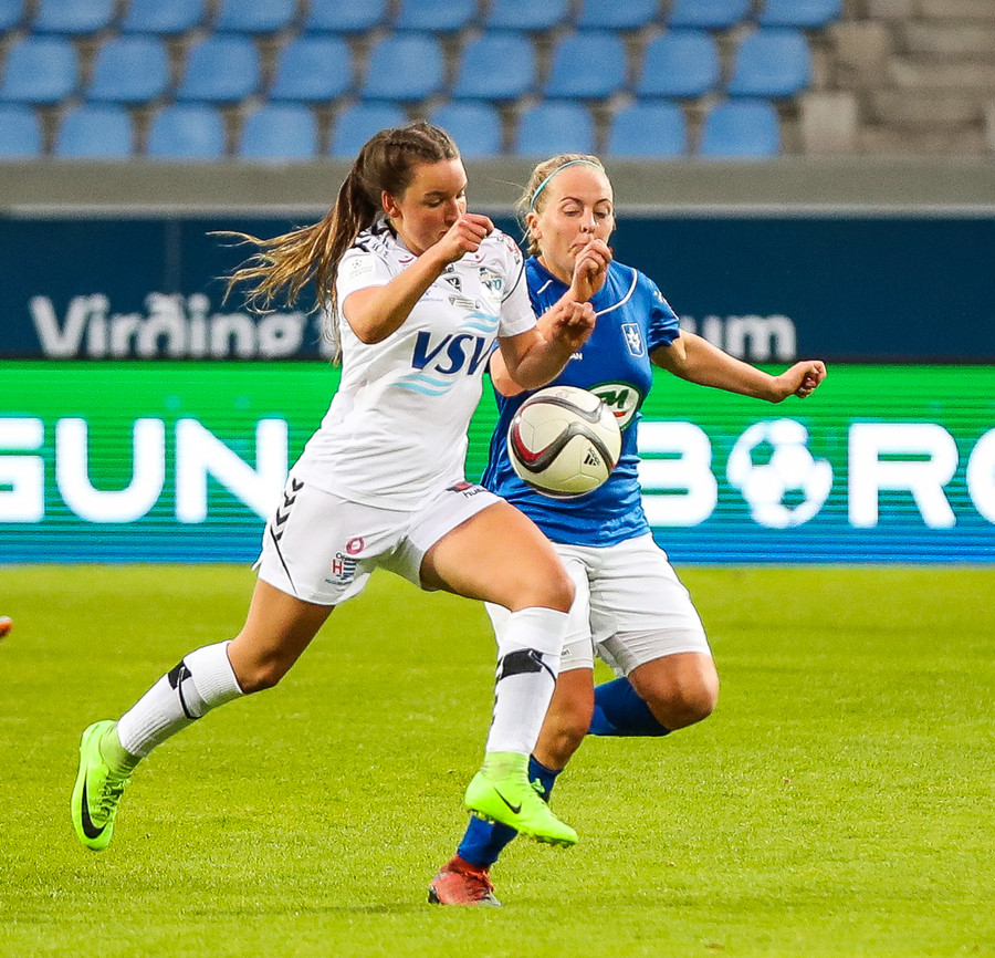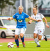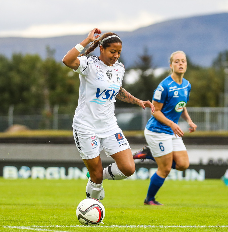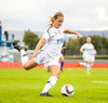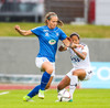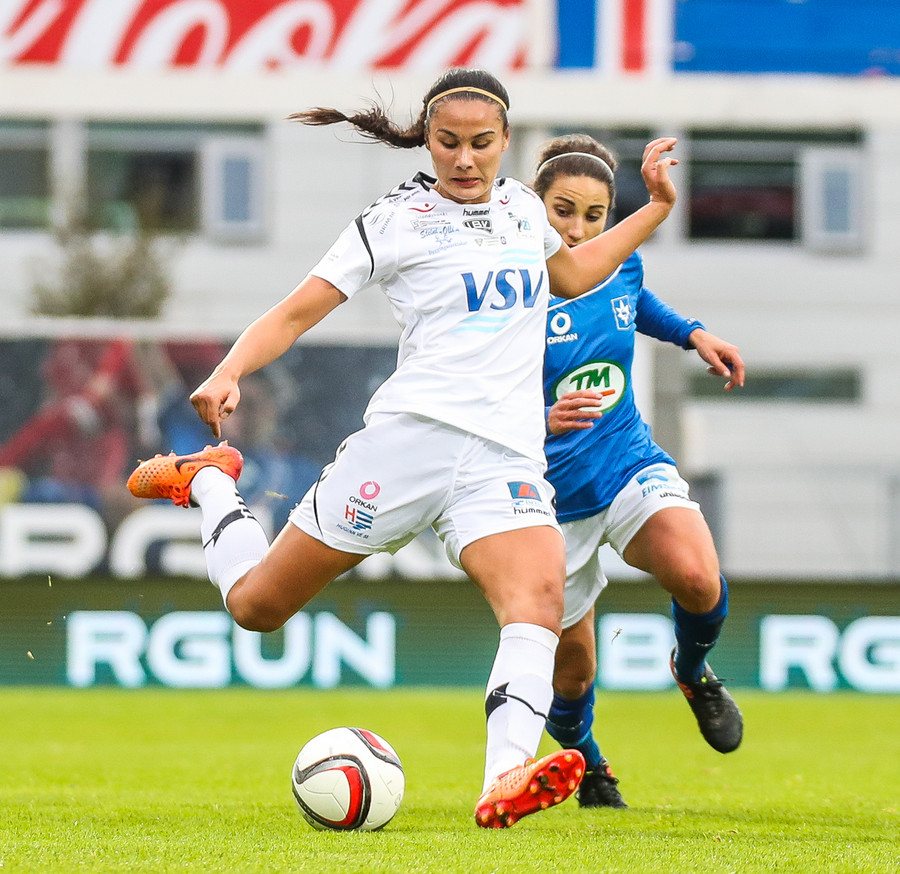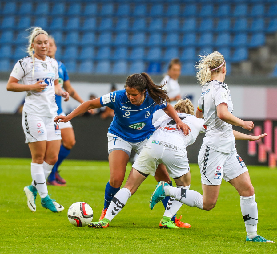 Gumma við það að sleppa ein í gegn! Harpa fær boltann úti vinstra megin, á frábæran snúning en Adrienne kemur á fullri ferð og sendir hann til baka á Caroline, sem lendir í einhverjum smá vandræðum og Gumma er hársbreidd frá því að ná að færa sér það í nyt en Caroline bjargar sér fyrir horn!!
