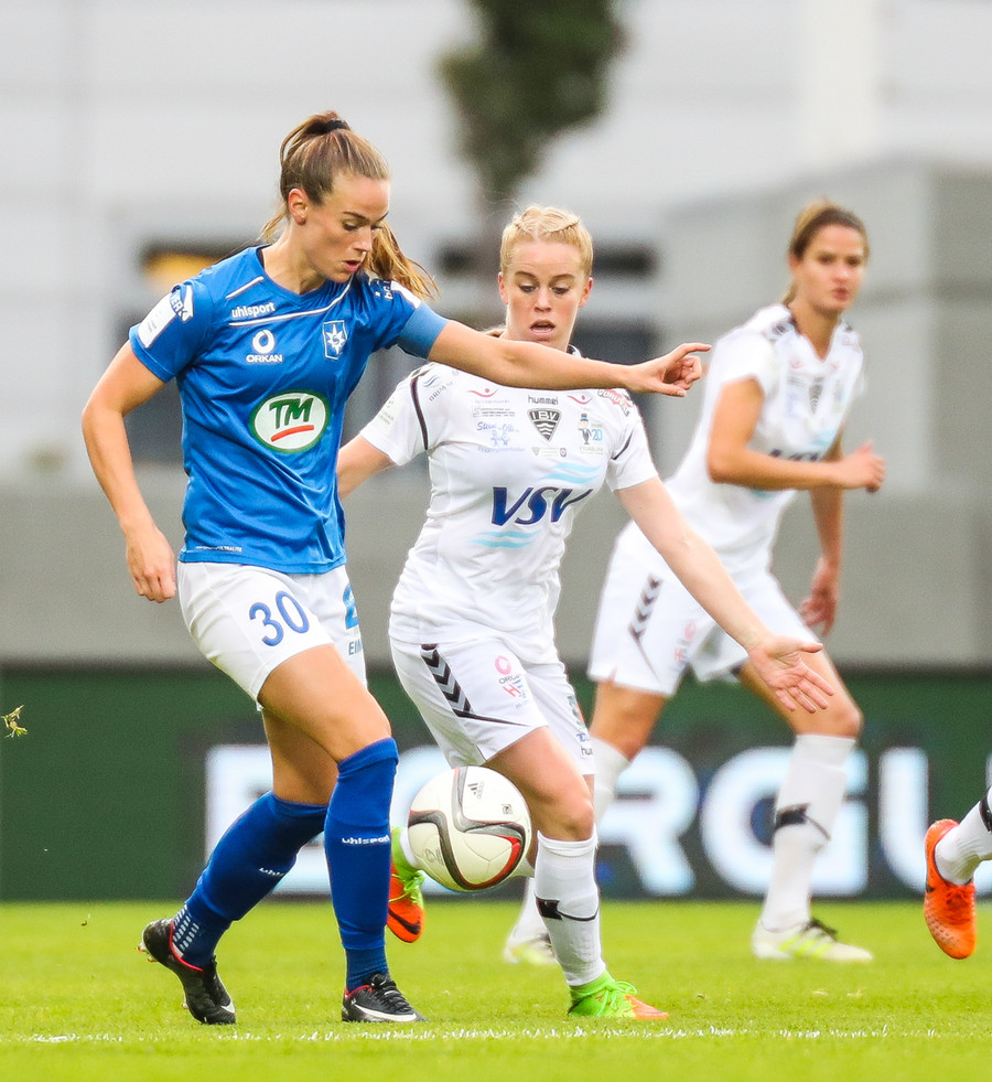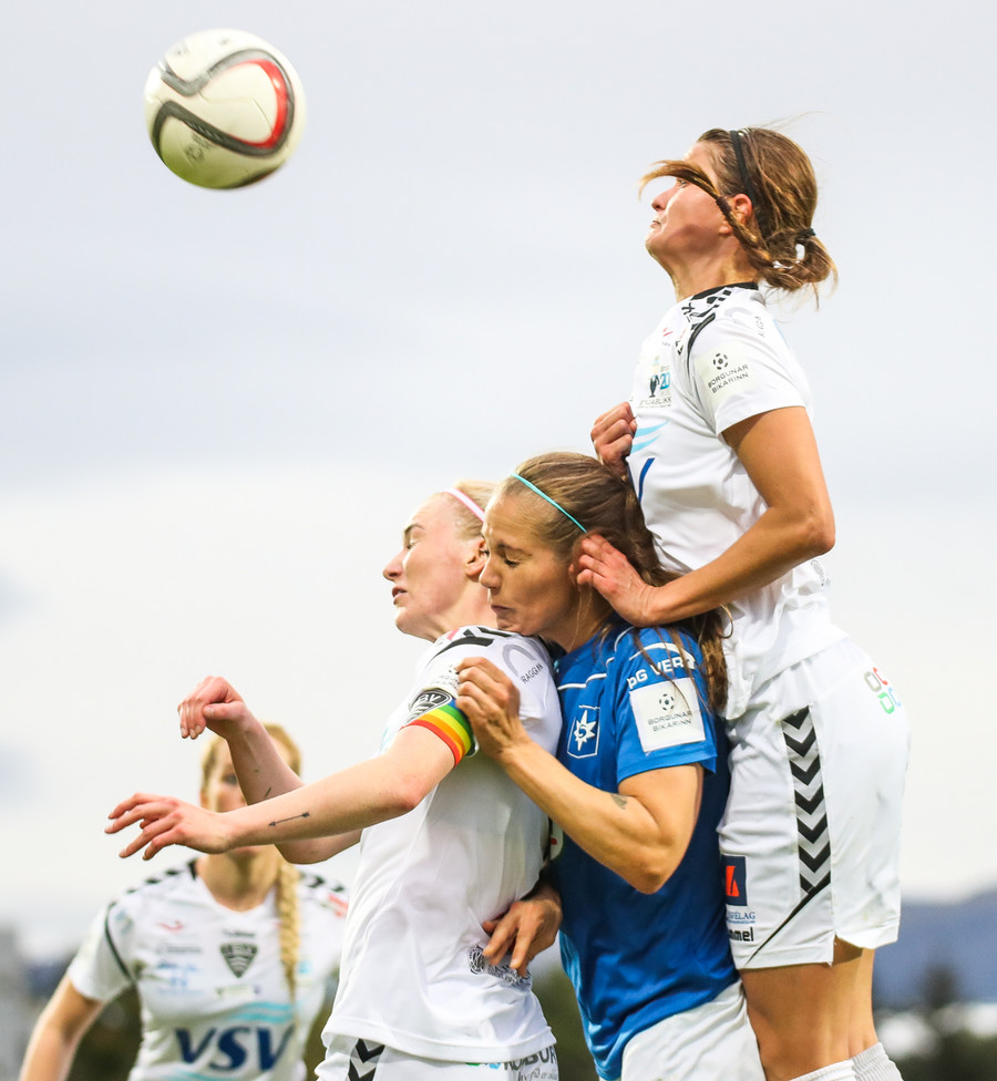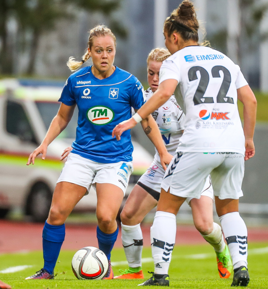 Sóley tekur aukaspyrnuna en sóknarmenn ÍBV spila sig rangstæðar.