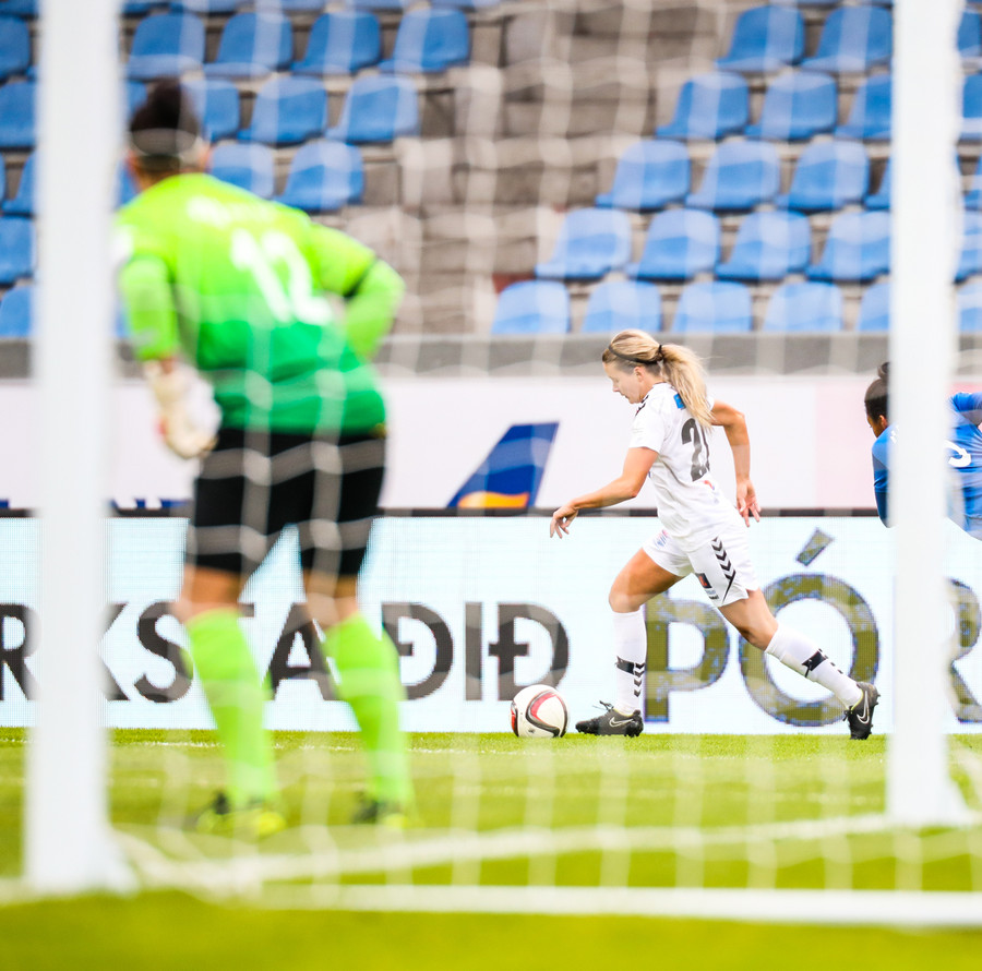 Sísí með fast skot en það er rétt framhjá. Clara fékk boltann inná teignum, var nálægt því að snúa á varnarmann en hún þarf að hörfa, sér þá Sísí fyrir utan teiginn og rennir boltanum út í skot fyrir hana.