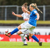 Sesselja með góða sendingu upp í horn hægra megin til Kristínar Ernu sem er í miklu kapphlaupi við Gemmu sem gerir mjög vel og nær til hans fyrst, utarlega í teignum.