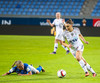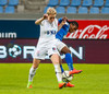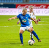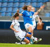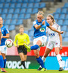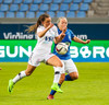 Lára Kristín lætur aðeins finna fyrir sér hérna með harkalegri tæklingu á Adrienne ca 10 m frá miðlínu á vallarhelmingi Stjörnunnar.