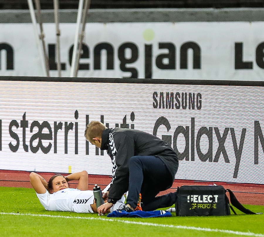 Ég var að enda við að segja að það virtist sem Cloé ætti nóg inni! Og það sýndi hún hérna! Hún fékk boltann upp vinstra megin frá Sísí. Hún hafði smá pláss og tók á rás í átt að Kim og Katrínu sem stóðu á vítateigshorninu. Hún kemur á mikilli ferð og Kim setur út fótinn, sem er nóg til að Cloé fellur við! Veit ekki hvort að snertingin var mikil en hún var næg fyrir Bríeti til að dæma víti.