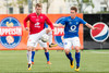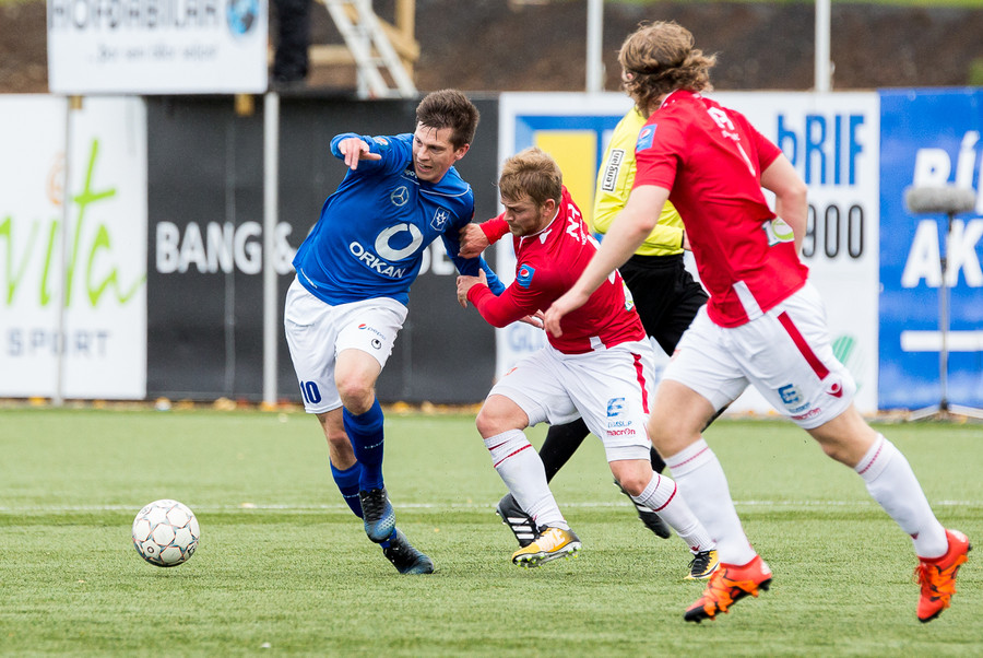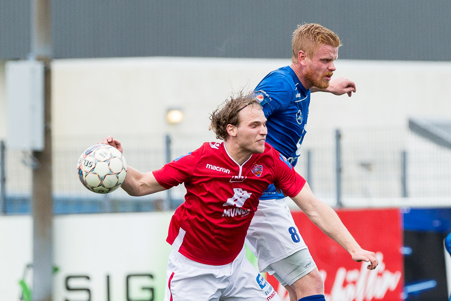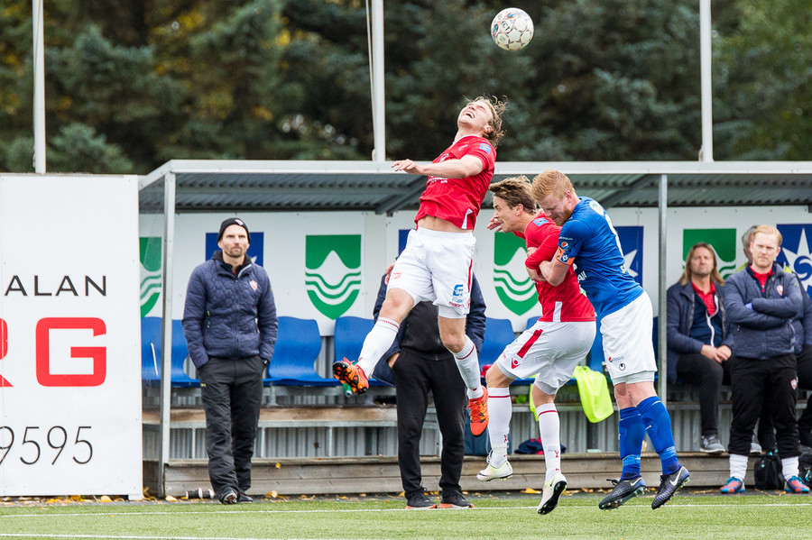Dauðafæri! Jóhann Laxdal með fyrirgjöfina frá hægri inn á markteiginn þar sem Baldur er einn og óvaldaður. Baldur nær skallanum en Anton ver glæsilega.