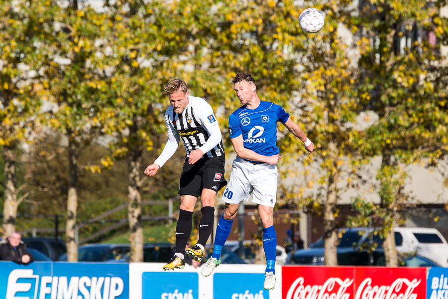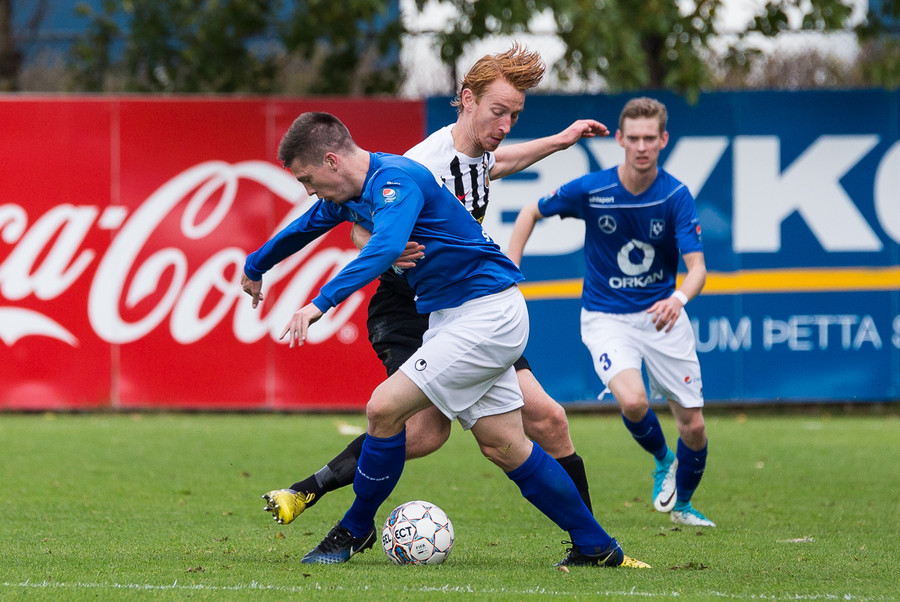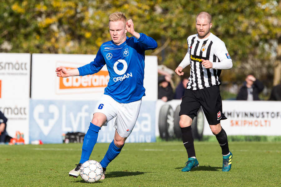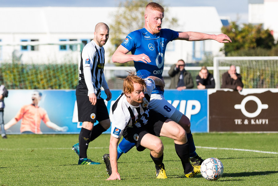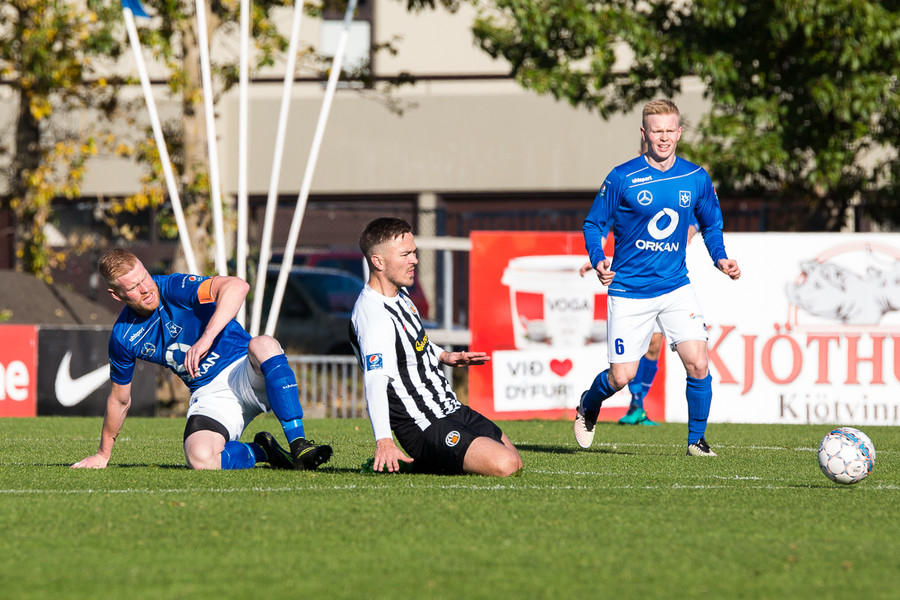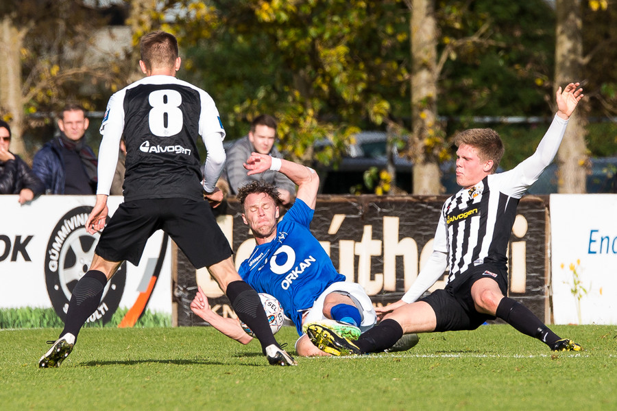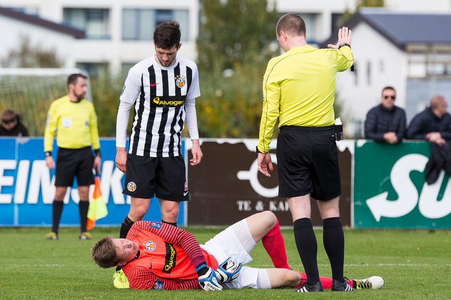 Óskar Örn brýtur hérna á Þorra Geir sem liggur eftir. Hefði vel getað fengið spjald þarna.