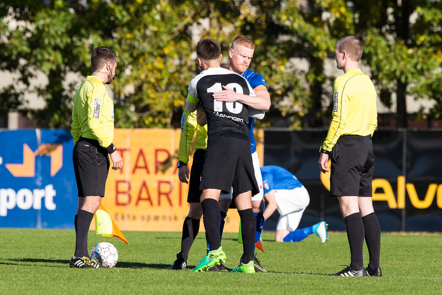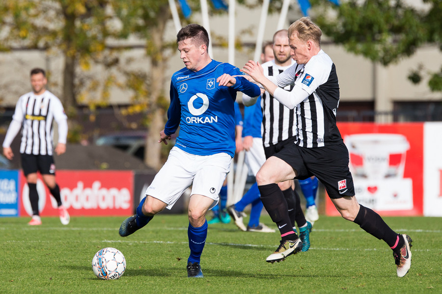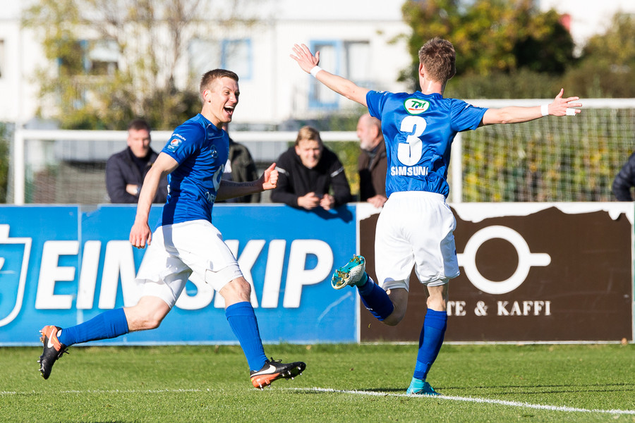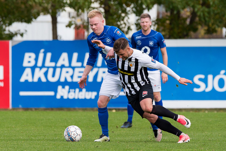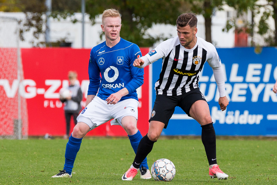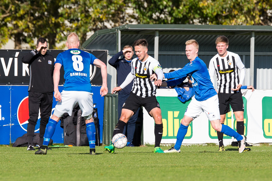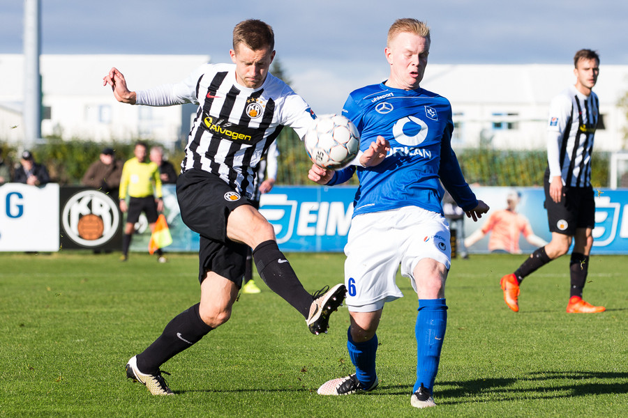 Óskar Örn brýtur hérna á Þorra Geir sem liggur eftir. Hefði vel getað fengið spjald þarna.