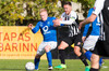 Guðmundur Andri við það að sleppa í gegn en Hörður Árnason bjargar með góðri tæklingu.
