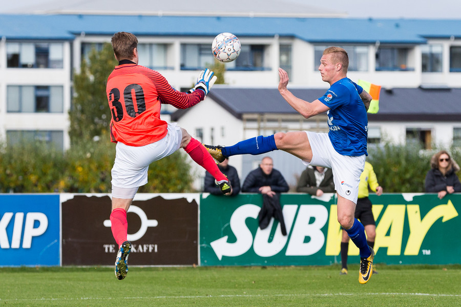 Óskar Örn hérna með chippu sem að Harladur Björnsson á í örlitlum vandræðum með en hann bjargar sér fyrir rest.
