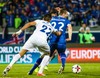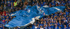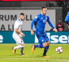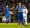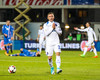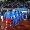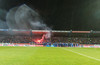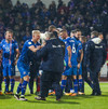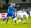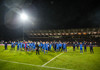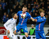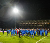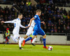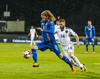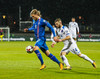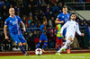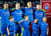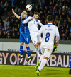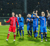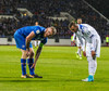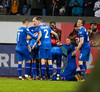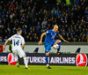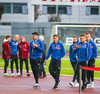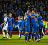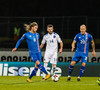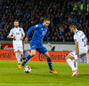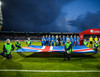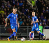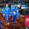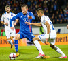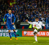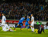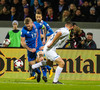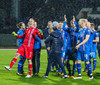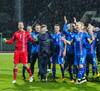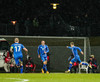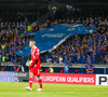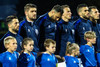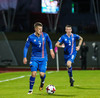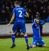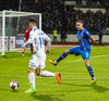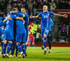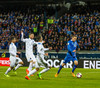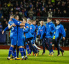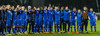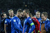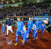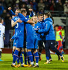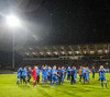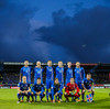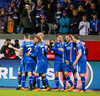 Íslendingar í sínum geggjuðu bláu treyjum. Leiknenn Kósóvo í hvítum treyjum í kvöld.