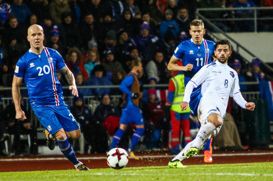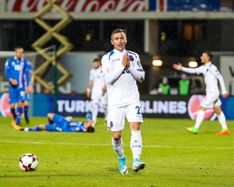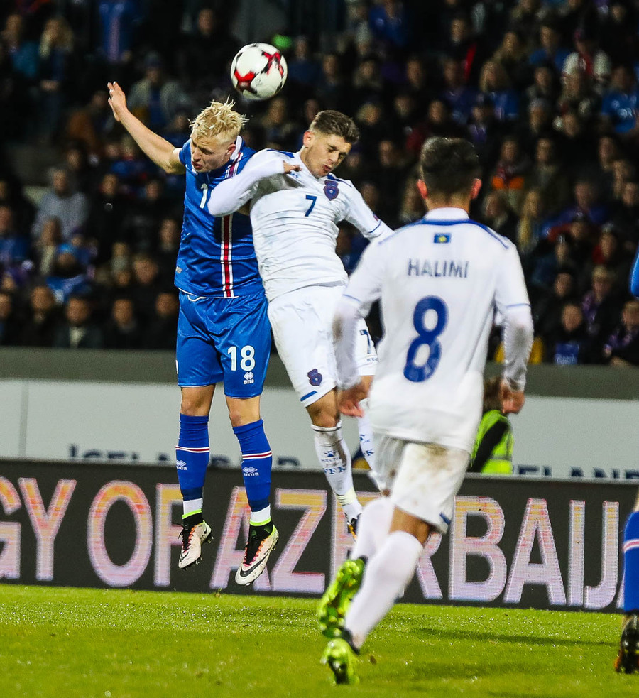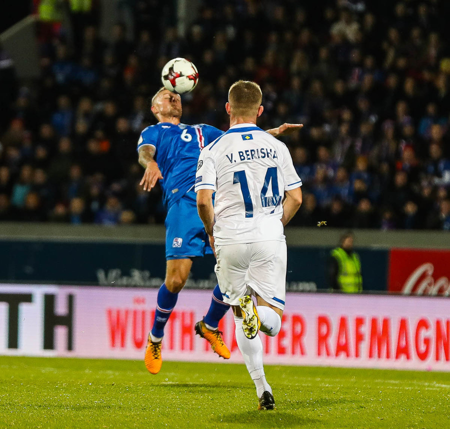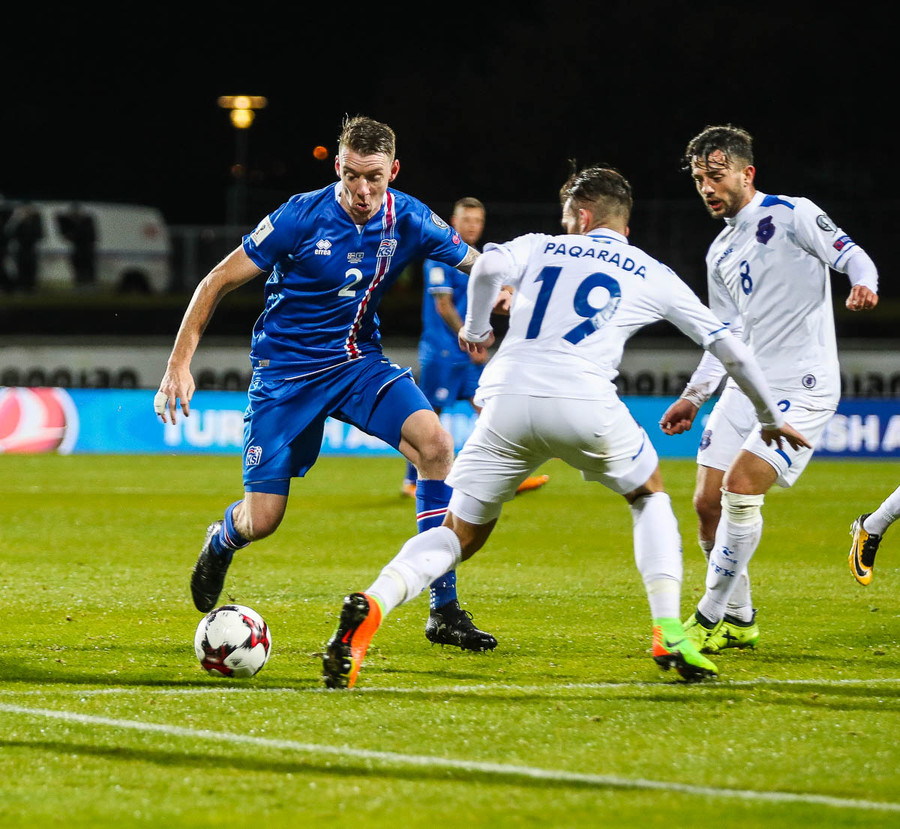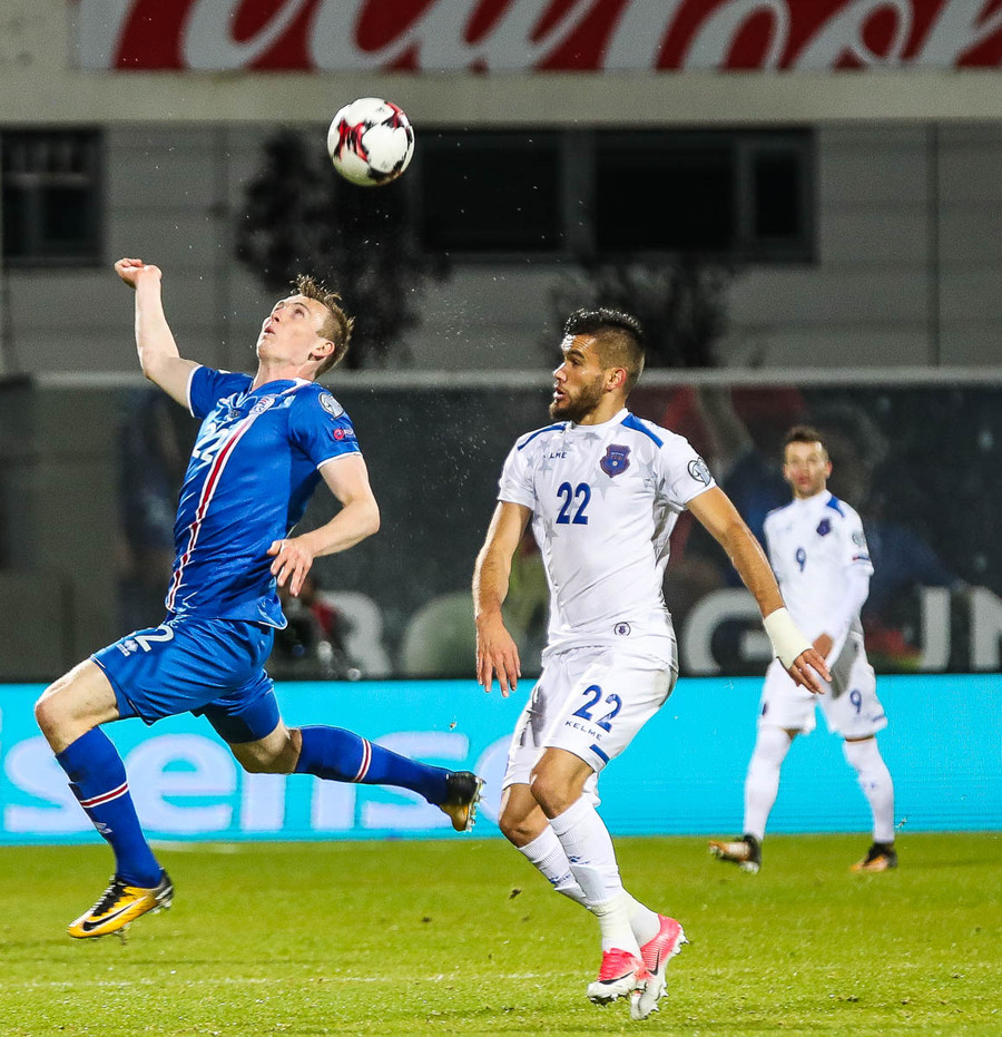 Boltinn lendir hjá Birki Bjarna sem er fyrir utan teig, reynir skotið en fer í varnarmann Kósóvo og þaðan framar á völlinn. Birkir Már hinsvegar vel á verði og sparkar boltanum burt áður en sóknarmenn Kósóvó komast í hann.