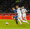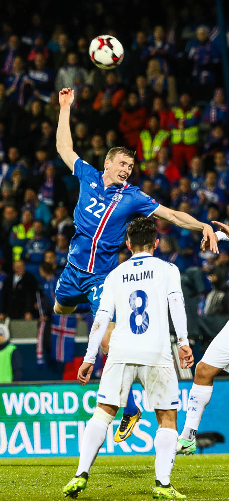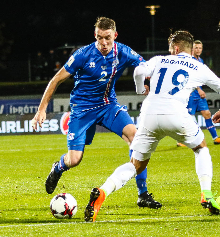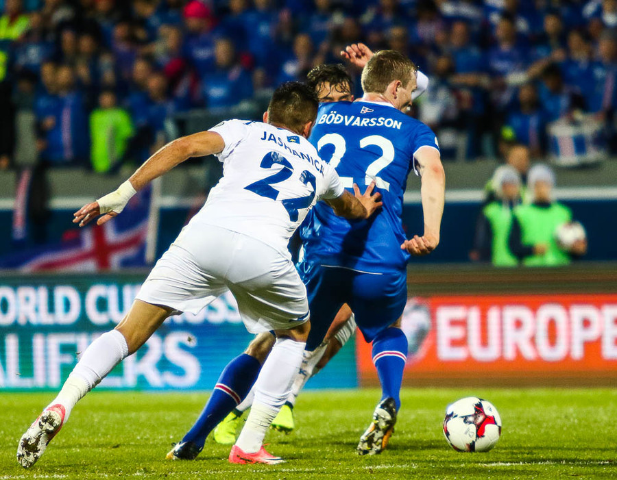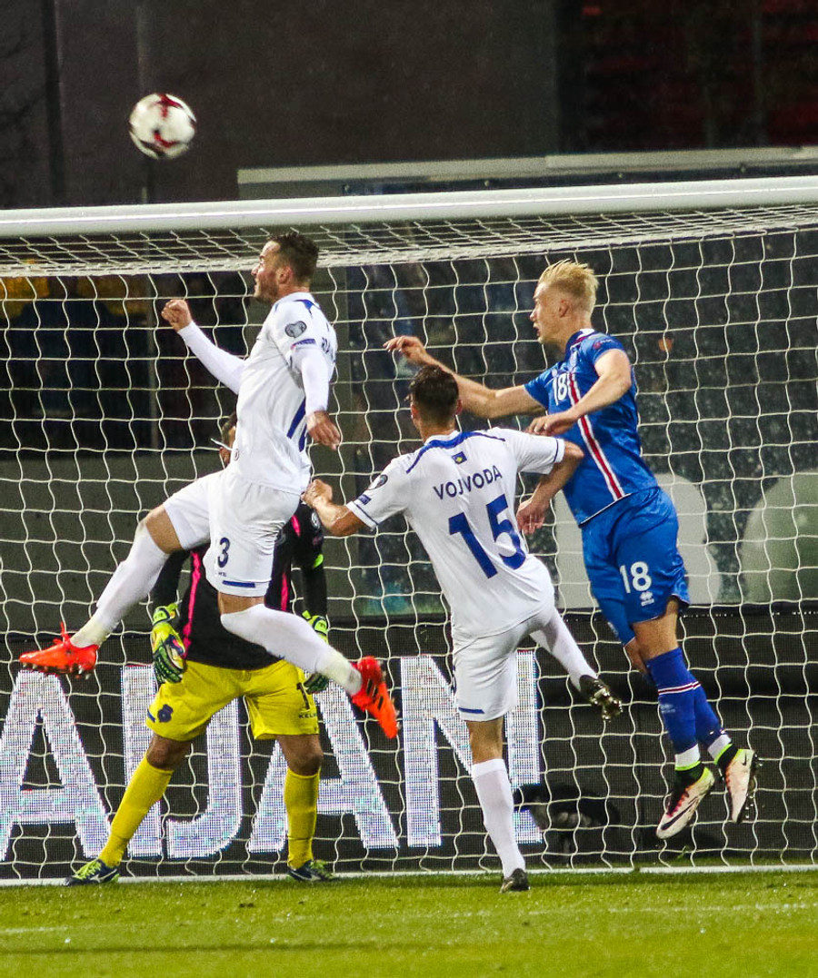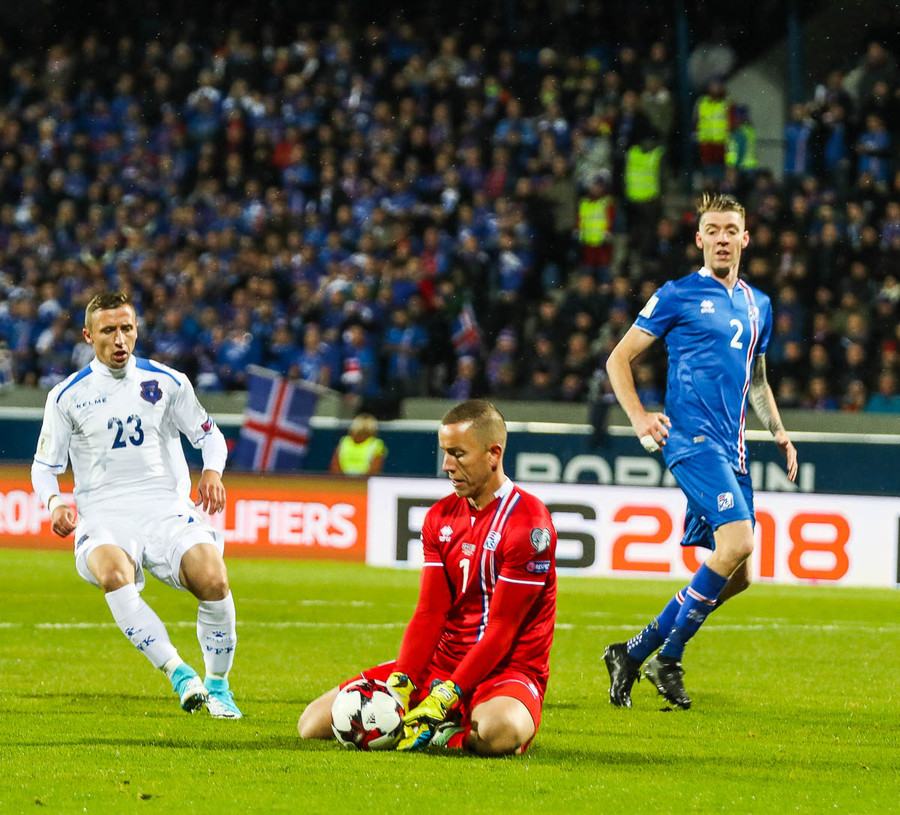 Boltinn lendir hjá Birki Bjarna sem er fyrir utan teig, reynir skotið en fer í varnarmann Kósóvo og þaðan framar á völlinn. Birkir Már hinsvegar vel á verði og sparkar boltanum burt áður en sóknarmenn Kósóvó komast í hann.