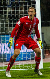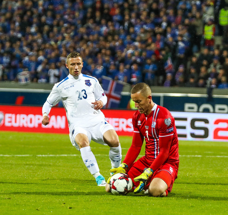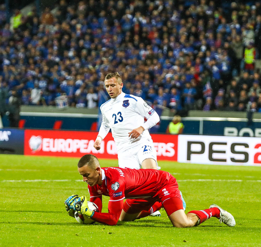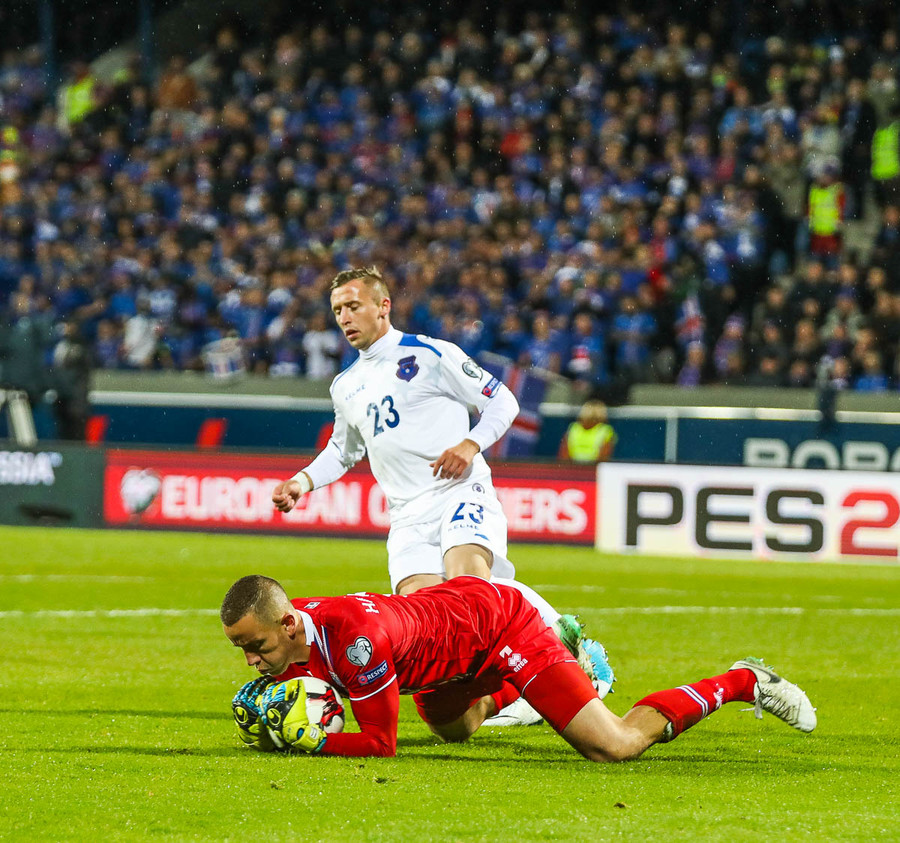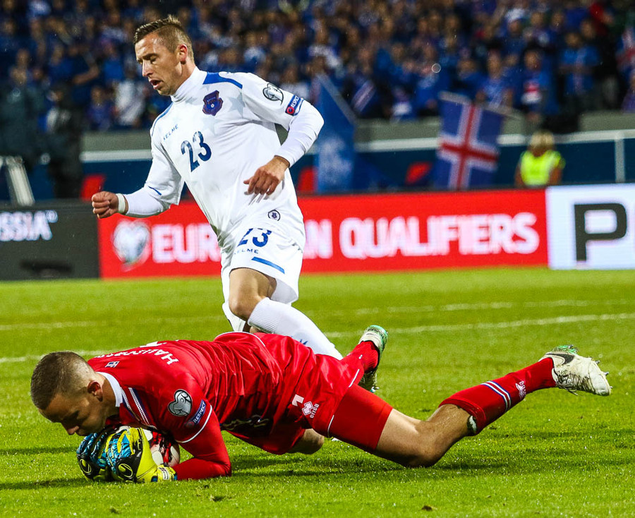 Markmaður Kósóvo, Samir Ujkani þarf að spyrna boltanum í innkast eftir góða pressu frá Gylfa!