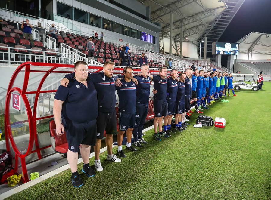 Þá hefst annað bænakall. Íslenska landsliðið er vant bænaköllum frá þeim útileikjum sem það hefur spilað í síðustu undankeppnum.